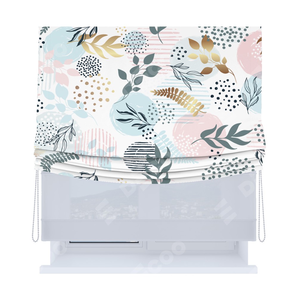 Римская штора день-ночь производителя «Cortin», используется для проёма, пошита из двух полотен, с лицевой блэкаут с нанесением сублимационной печати «Точки и листочки», вторая ткань тюль (по стандарту комплектуется тюль белого цвета артикул V-01). Имеет универсальный механизм и подходит для монтажа: на потолок, на стену и в нишу. Удобное управление каждой шторой отдельно.