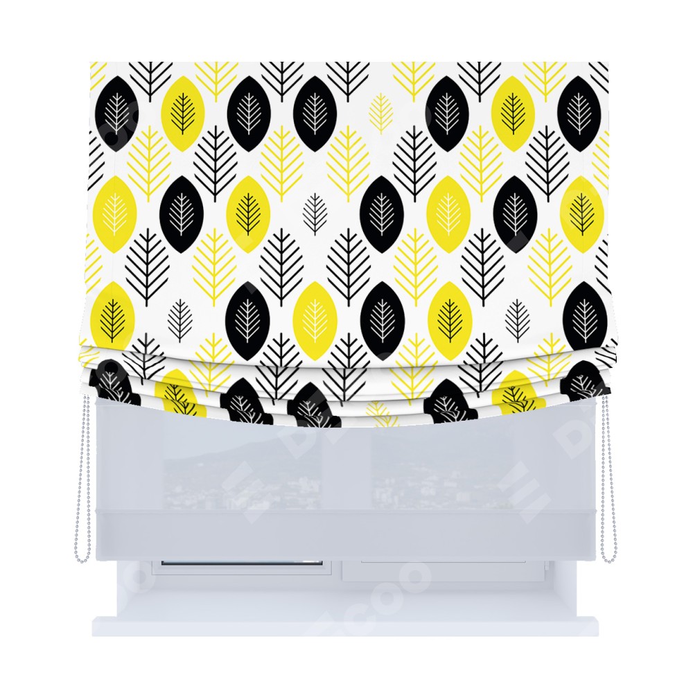 Римская штора день-ночь производителя «Cortin», используется для проёма, пошита из двух полотен, с лицевой блэкаут с нанесением сублимационной печати «Черно-желтый модерн», вторая ткань тюль (по стандарту комплектуется тюль белого цвета артикул V-01). Имеет универсальный механизм и подходит для монтажа: на потолок, на стену и в нишу. Удобное управление каждой шторой отдельно.