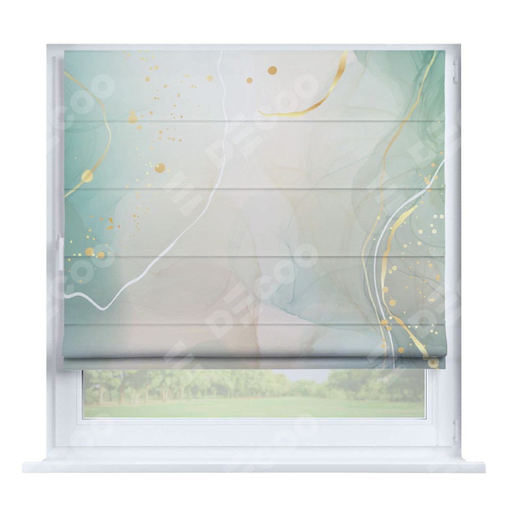 Римская штора производителя «Cortin», устанавливается на створку окна, пошита из ткани блэкаут с нанесением сублимационной печати «Изумрудно-серый мрамор». Штора шьётся по индивидуальным размерам, для данного типа римской шторы возможная ширина от 35 до 150 см., высота до 250 см.