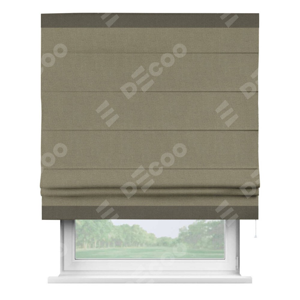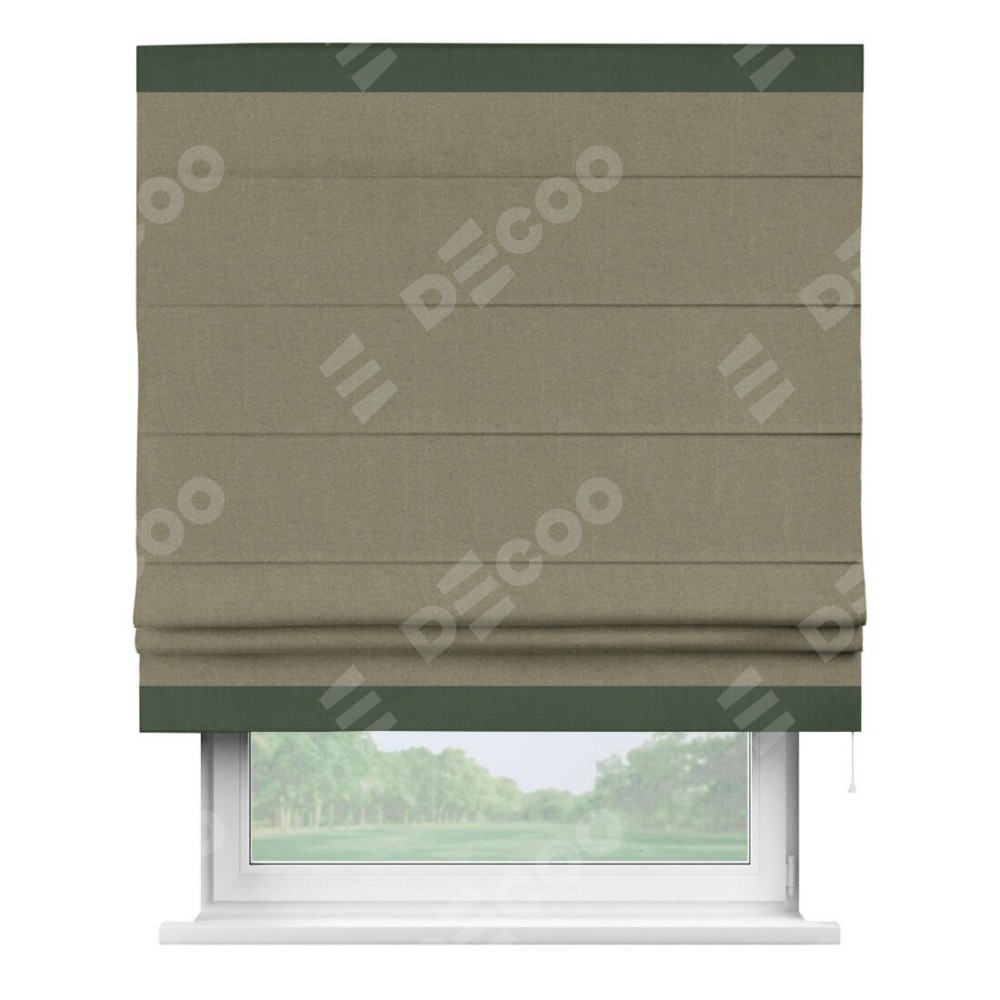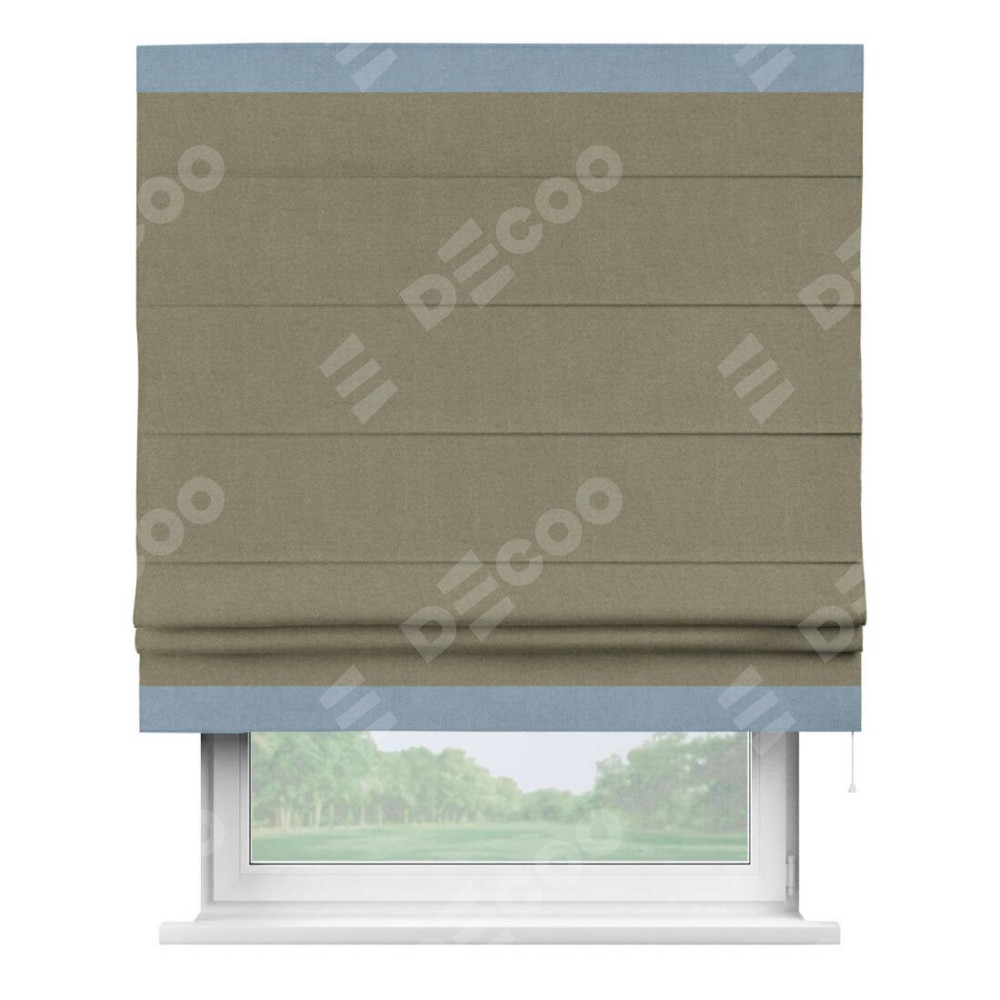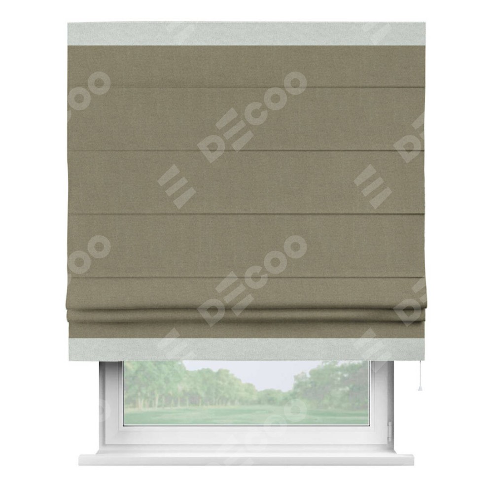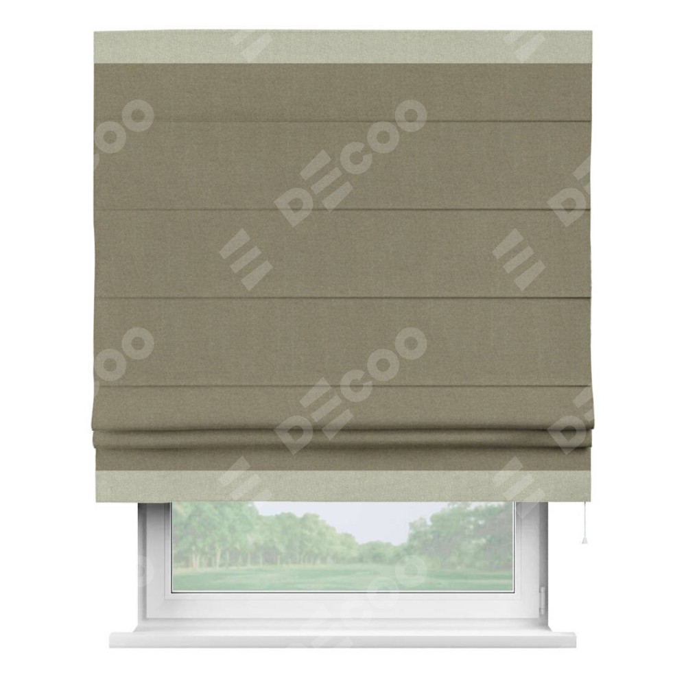 Римская штора производителя «Cortin», используется для проёма, пошита из ткани лён блэкаут бежевый, артикул 69435. Отделка шторы кантом «Горизонт», ткань для канта используется из льна разной расцветки на выбор. Имеет универсальный механизм и подходит для монтажа: на потолок, на стену и в нишу.