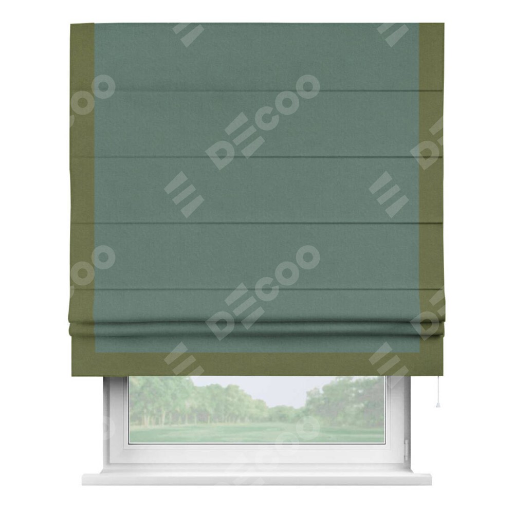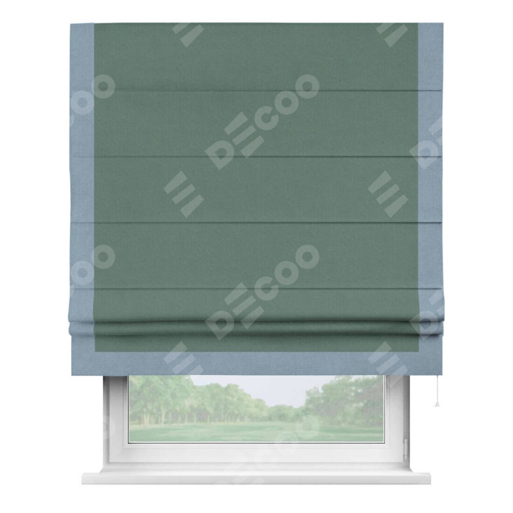 Римская штора производителя «Cortin», используется для проёма, пошита из ткани лён блэкаут бирюзовый, артикул 69517. Отделка шторы кантом «Виктория», ткань для канта используется из льна разной расцветки на выбор. Имеет универсальный механизм и подходит для монтажа: на потолок, на стену и в нишу.