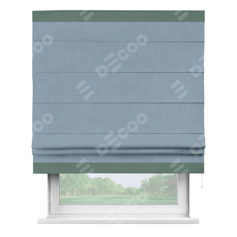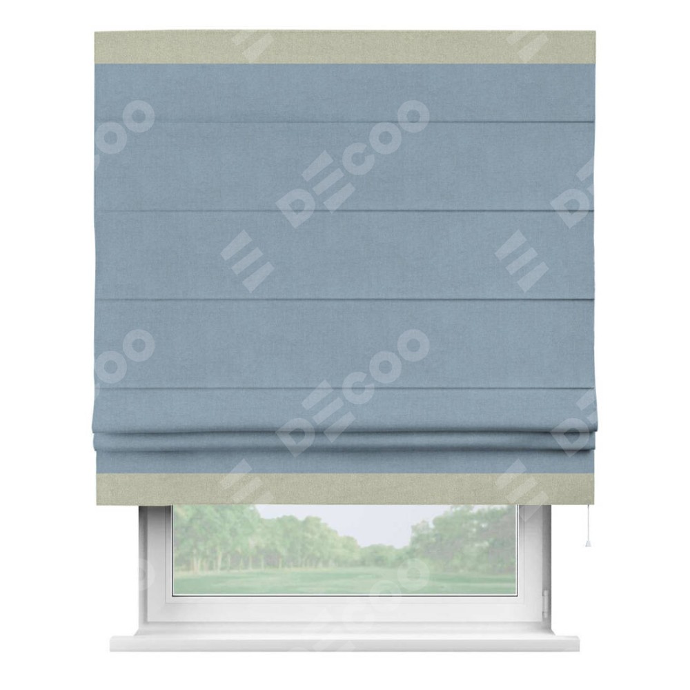 Римская штора производителя «Cortin», используется для проёма, пошита из ткани лён блэкаут голубой, артикул 69574. Отделка шторы кантом «Горизонт», ткань для канта используется из льна разной расцветки на выбор. Имеет универсальный механизм и подходит для монтажа: на потолок, на стену и в нишу.