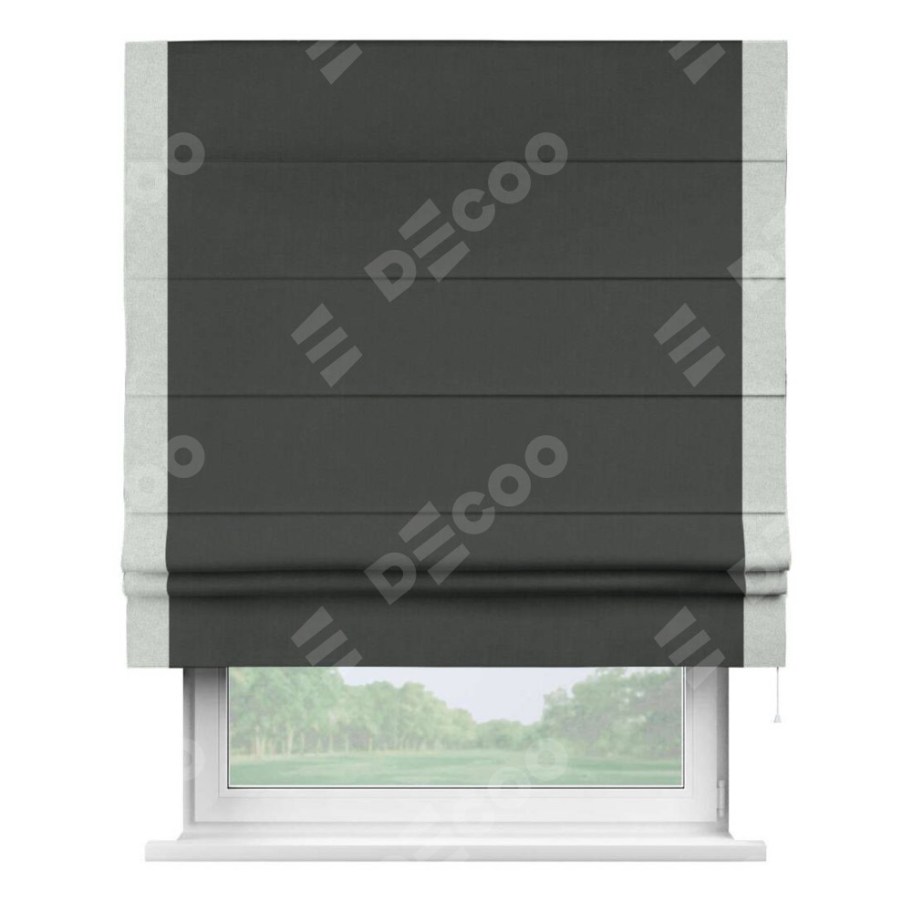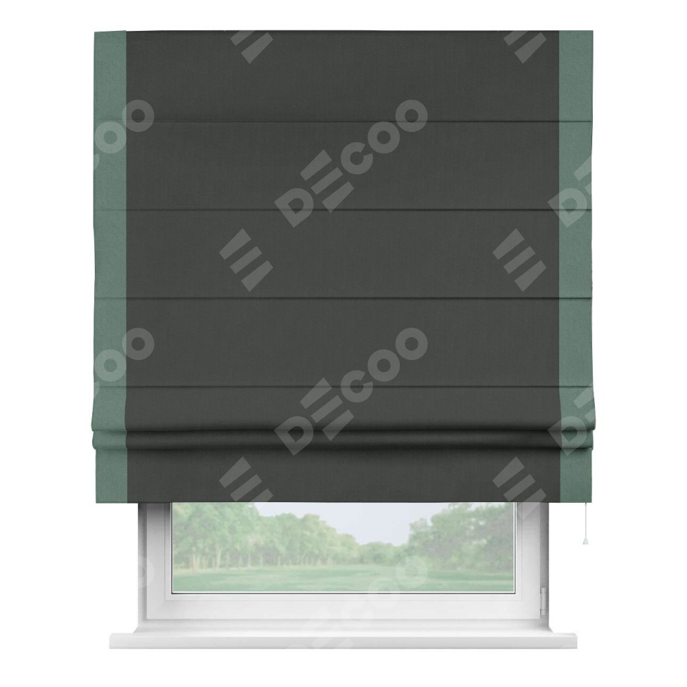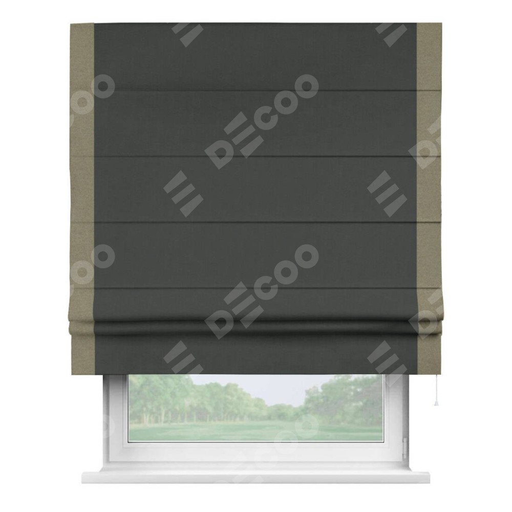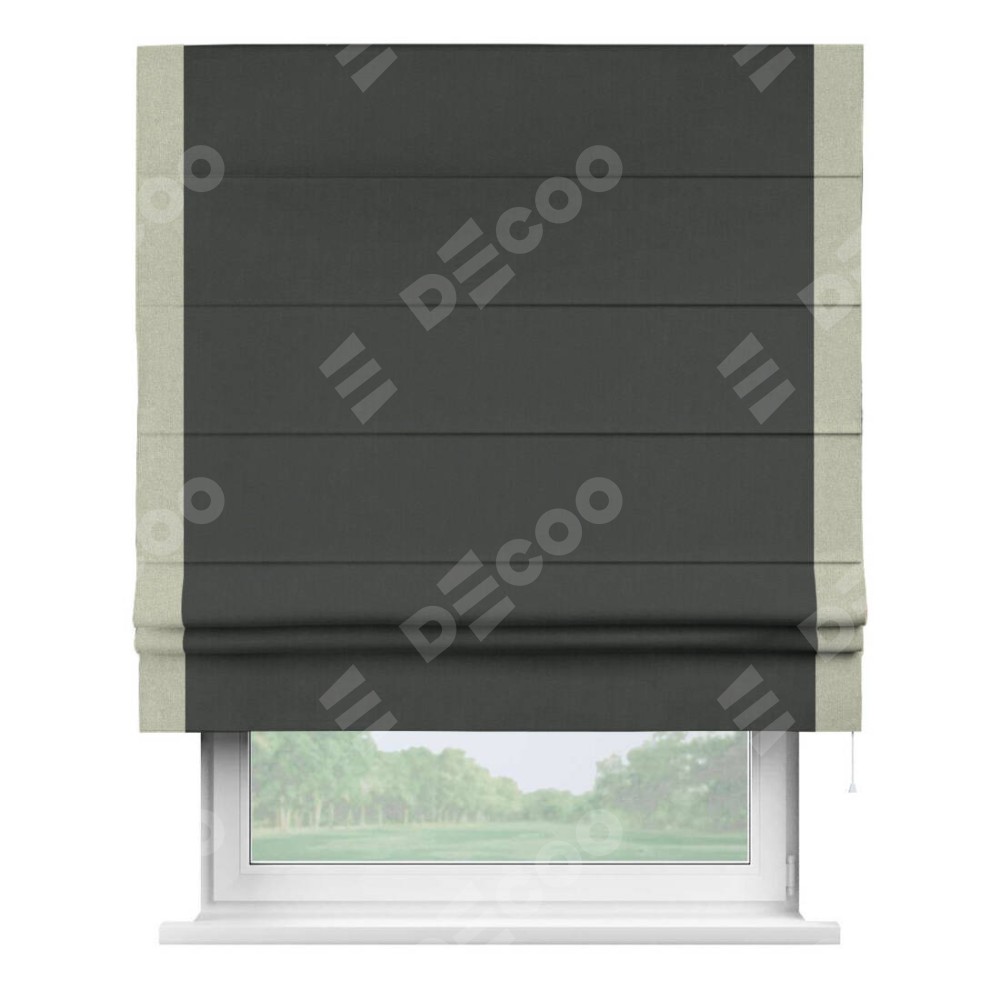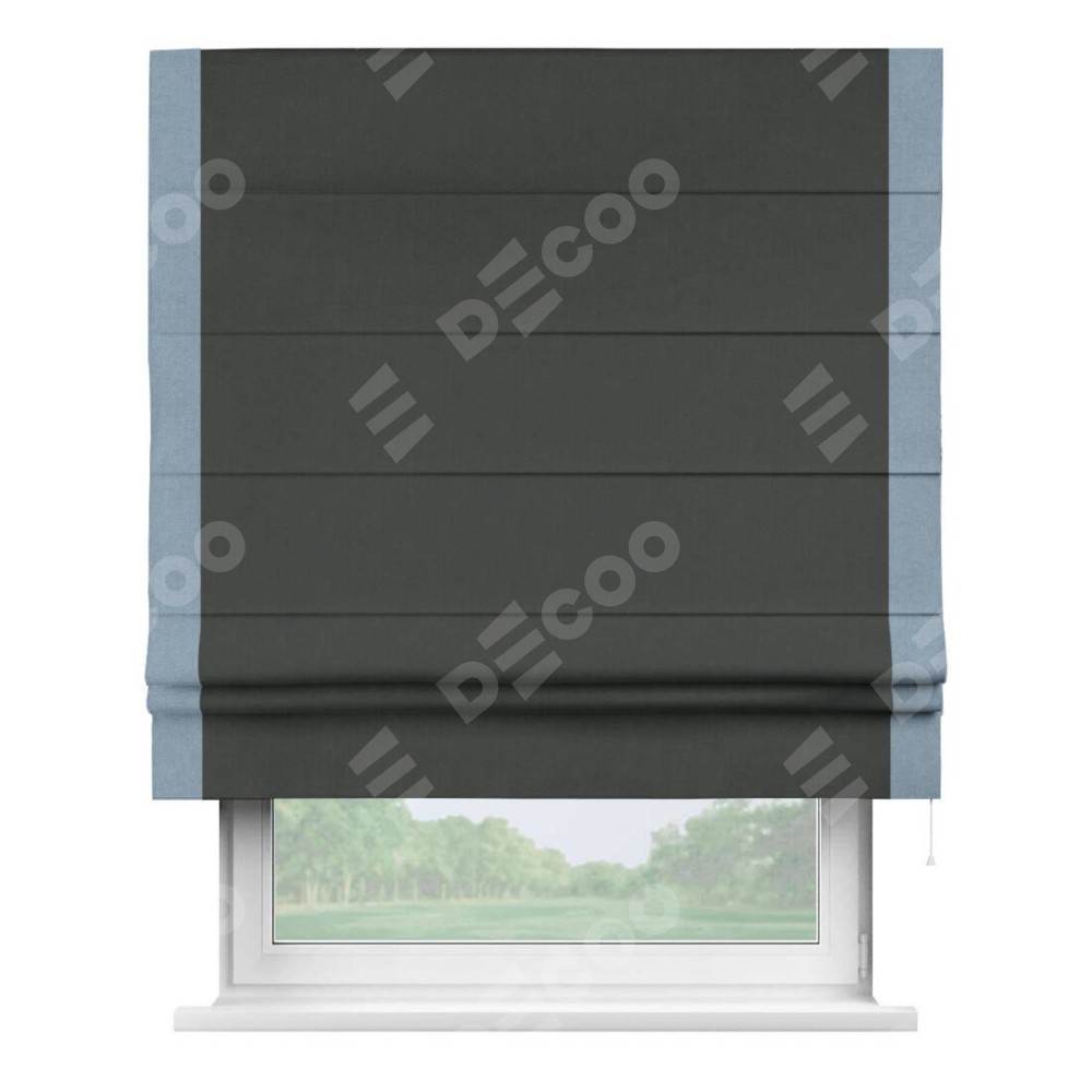 Римская штора производителя «Cortin», используется для проёма, пошита из ткани лён блэкаут графит, артикул 69448. Отделка шторы кантом «Стрим Дуо», ткань для канта используется из льна разной расцветки на выбор. Имеет универсальный механизм и подходит для монтажа: на потолок, на стену и в нишу.