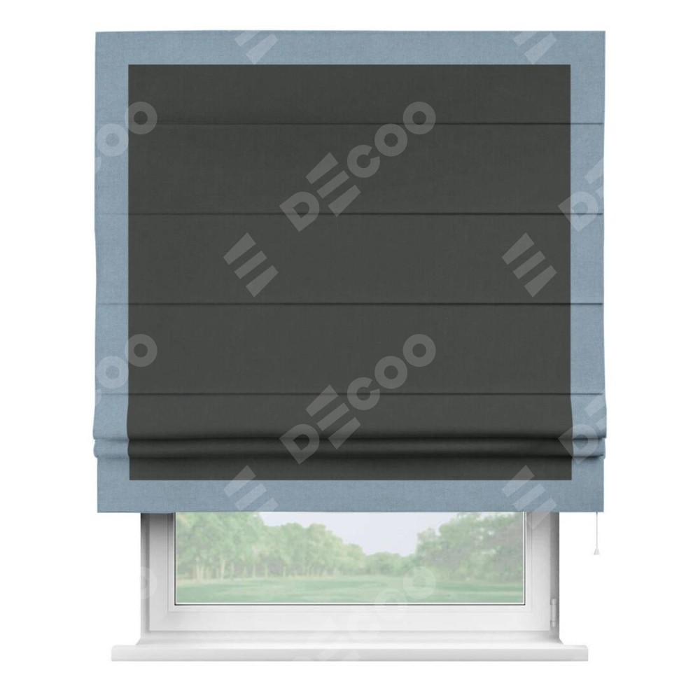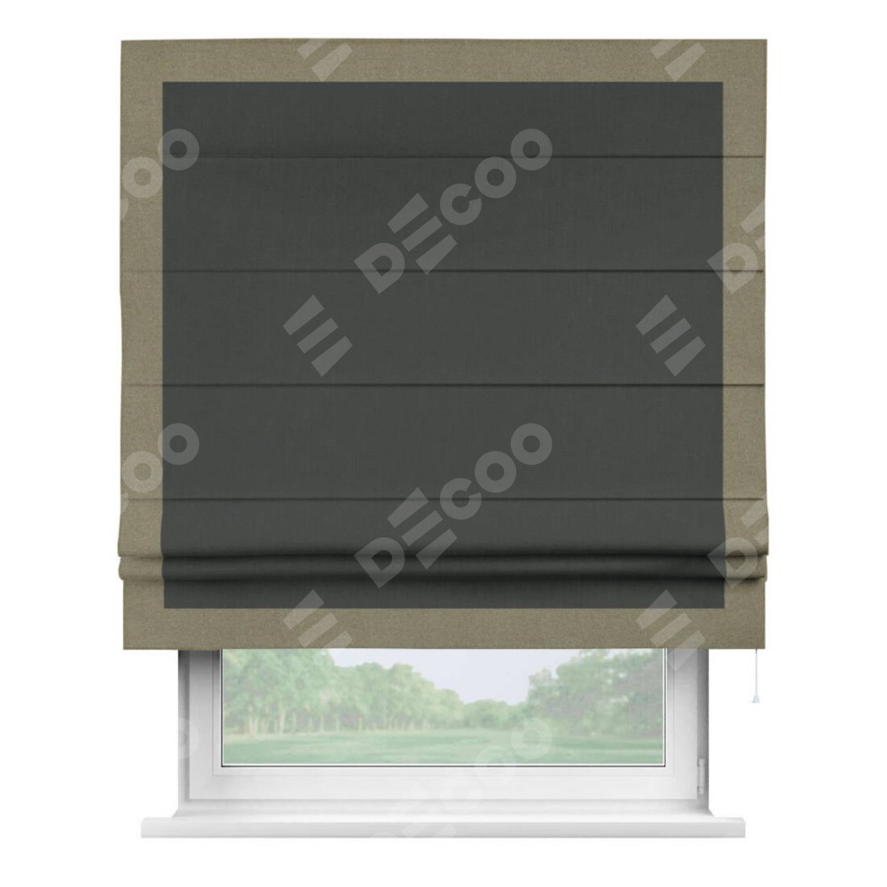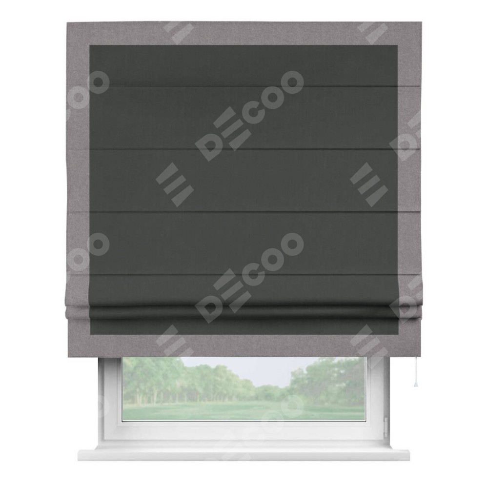 Римская штора производителя «Cortin», используется для проёма, пошита из ткани лён блэкаут графит, артикул 69448. Отделка шторы кантом «Чесс», ткань для канта используется из льна разной расцветки на выбор. Имеет универсальный механизм и подходит для монтажа: на потолок, на стену и в нишу.