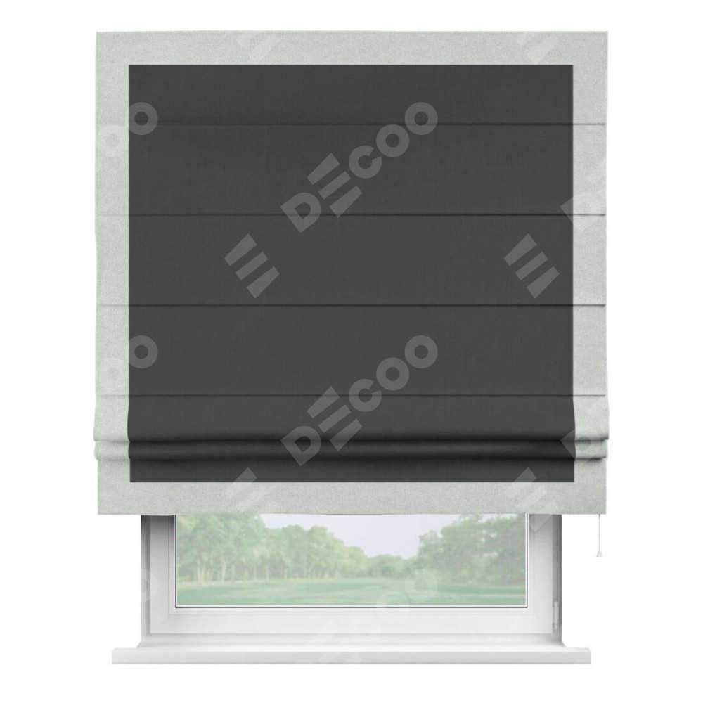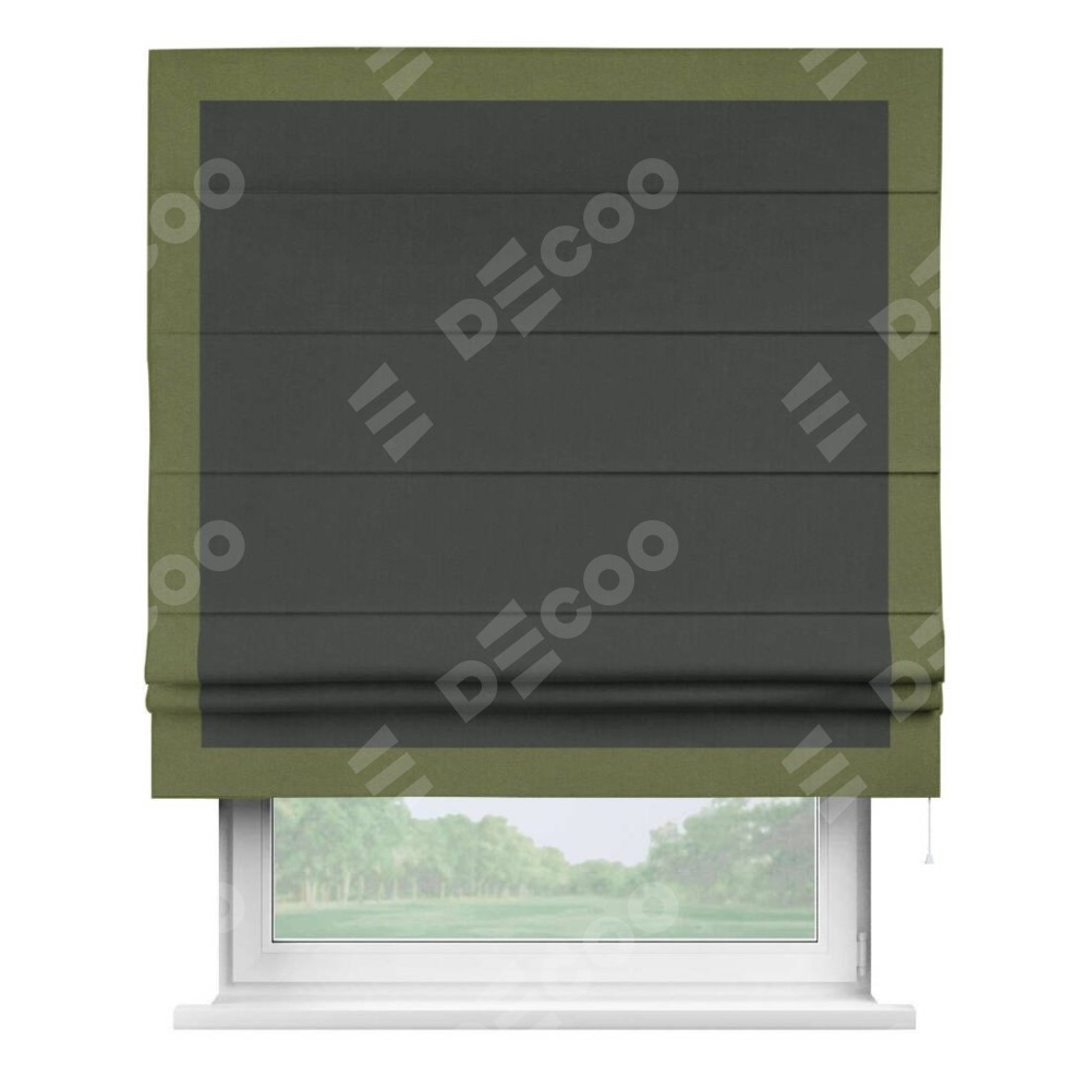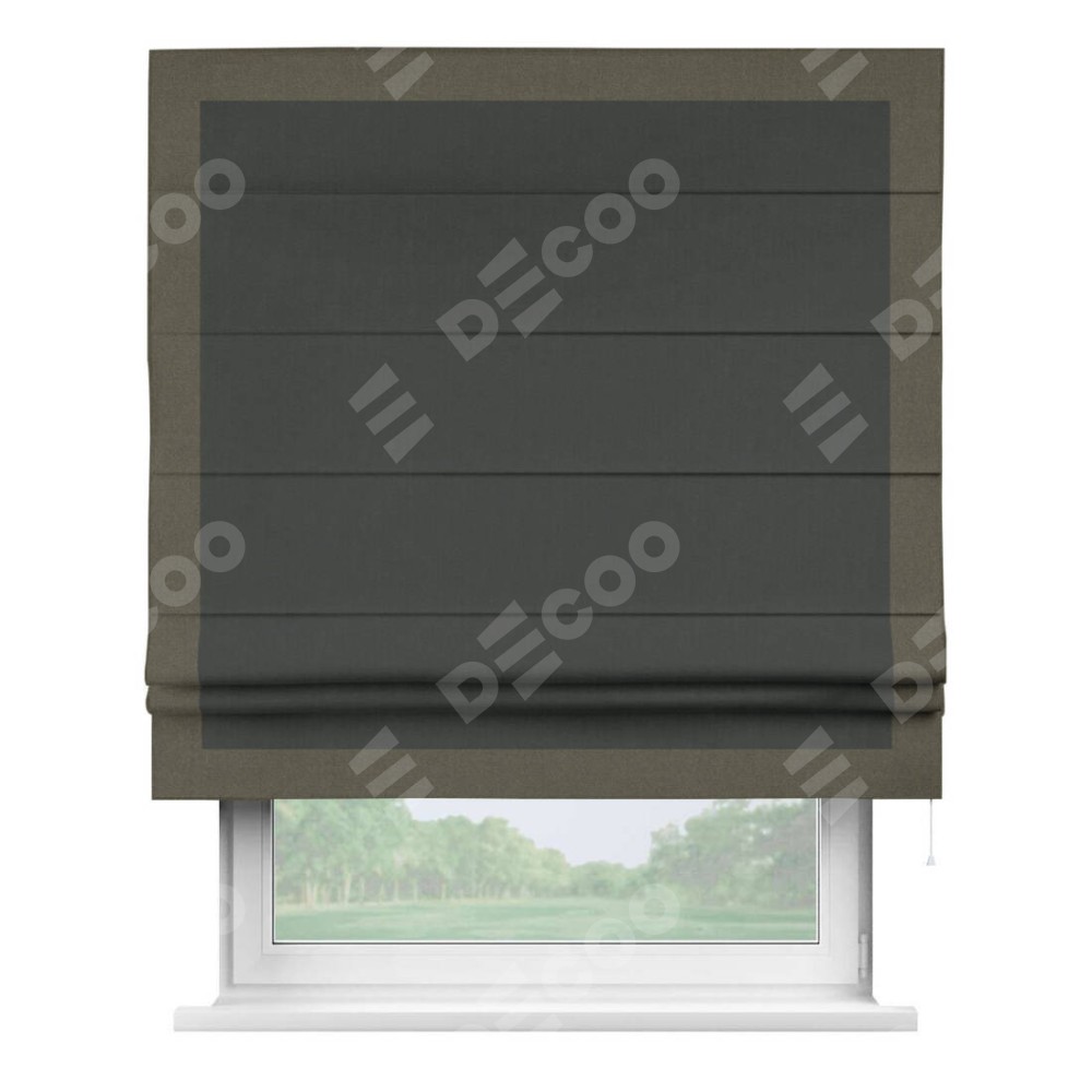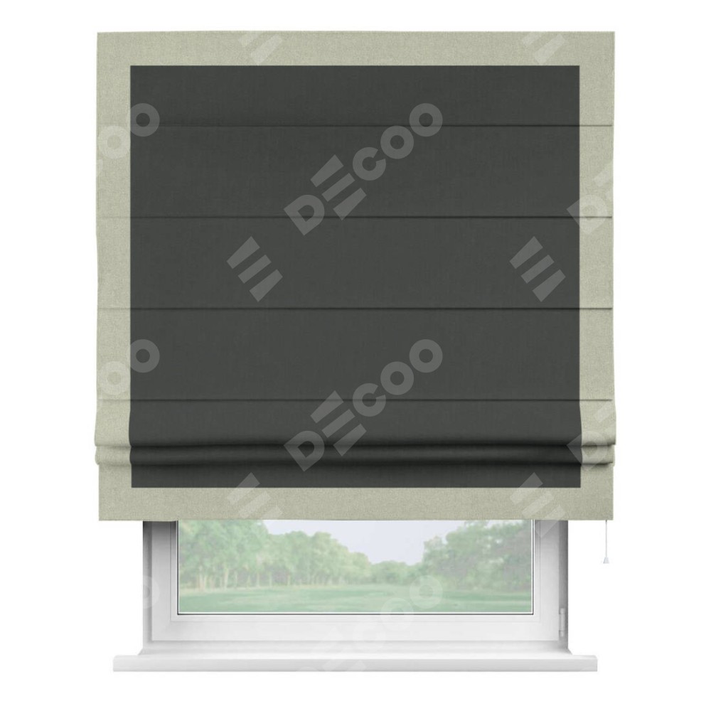 Римская штора производителя «Cortin», используется для проёма, пошита из ткани лён блэкаут графит, артикул 69448. Отделка шторы кантом «Чесс», ткань для канта используется из льна разной расцветки на выбор. Имеет универсальный механизм и подходит для монтажа: на потолок, на стену и в нишу.