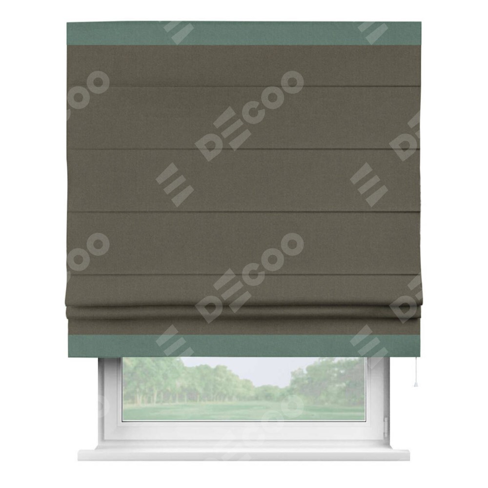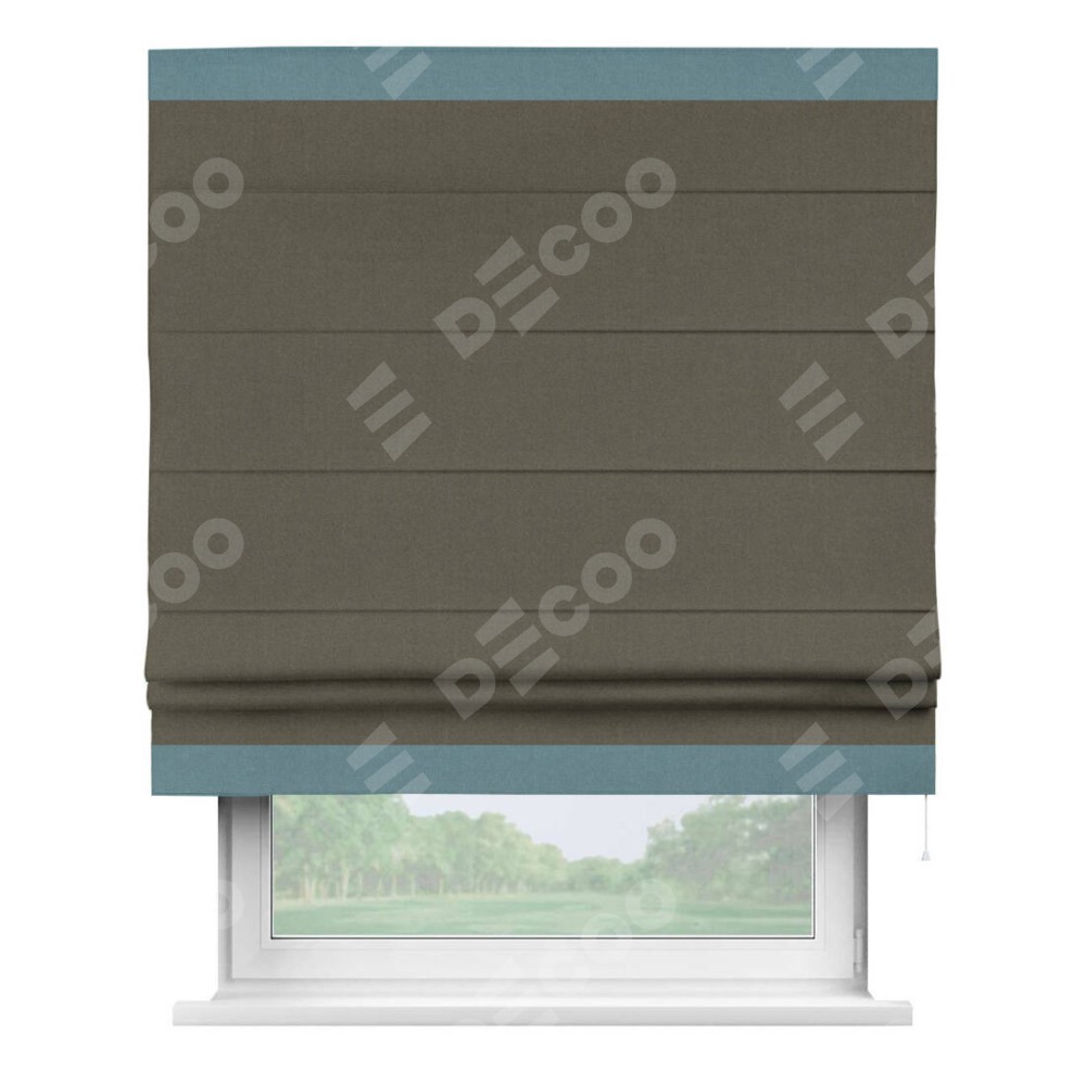 Римская штора производителя «Cortin», используется для проёма, пошита из ткани лён блэкаут коричневый, артикул 69383. Отделка шторы кантом «Горизонт», ткань для канта используется из льна разной расцветки на выбор. Имеет универсальный механизм и подходит для монтажа: на потолок, на стену и в нишу.