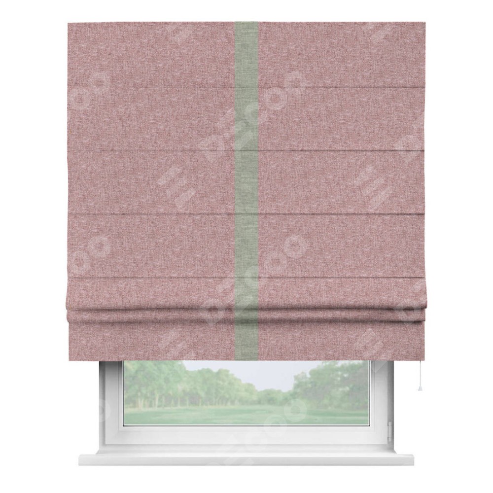 Римская штора производителя «Cortin», используется для проёма, пошита из ткани лён кашемир розовая пудра, артикул 21619. Отделка шторы кантом «Хайвэй», ткань для канта используется из льна разной расцветки на выбор. Имеет универсальный механизм и подходит для монтажа: на потолок, на стену и в нишу.