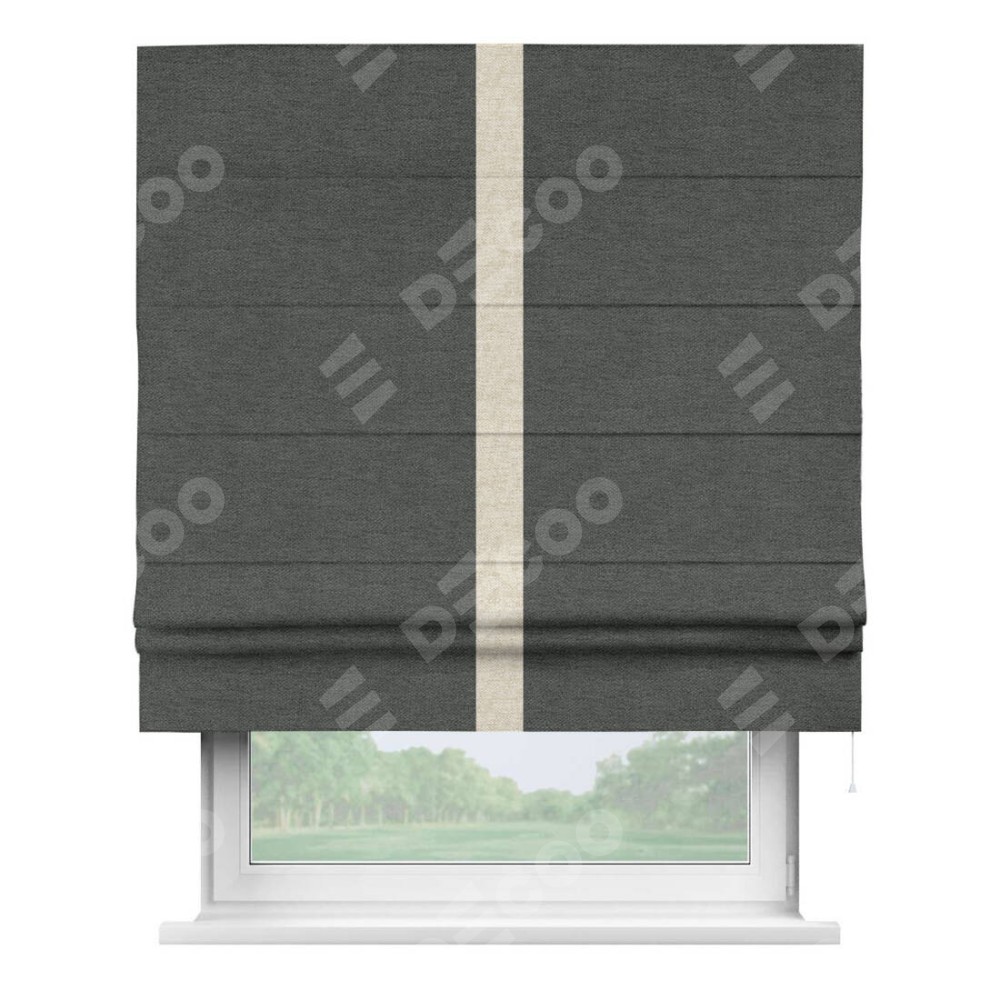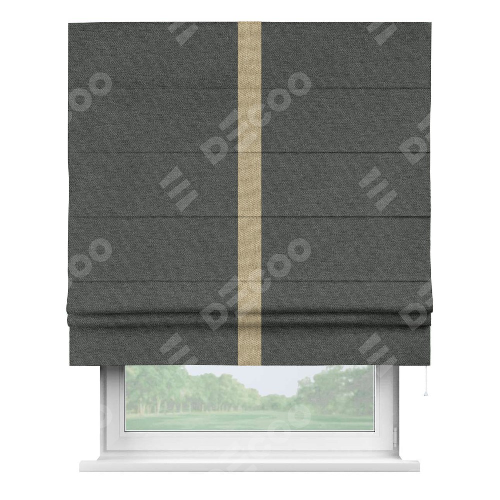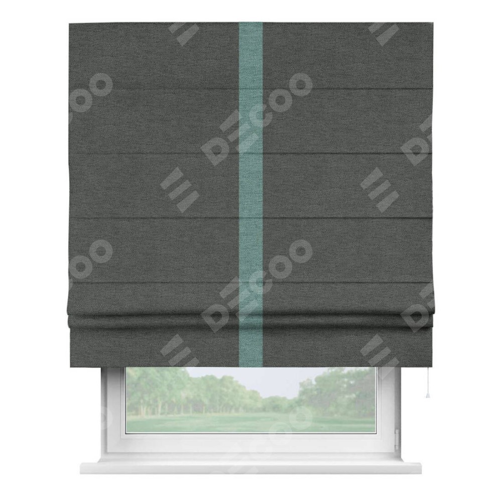 Римская штора производителя «Cortin», используется для проёма, пошита из ткани стиф димаут графит, артикул 44026. Отделка шторы кантом «Хайвэй», ткань для канта используется из стифа разной расцветки на выбор. Имеет универсальный механизм и подходит для монтажа: на потолок, на стену и в нишу.