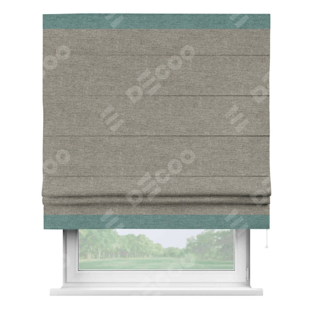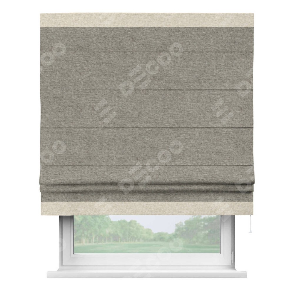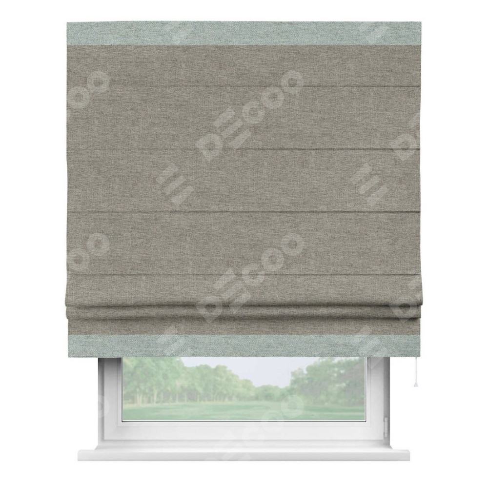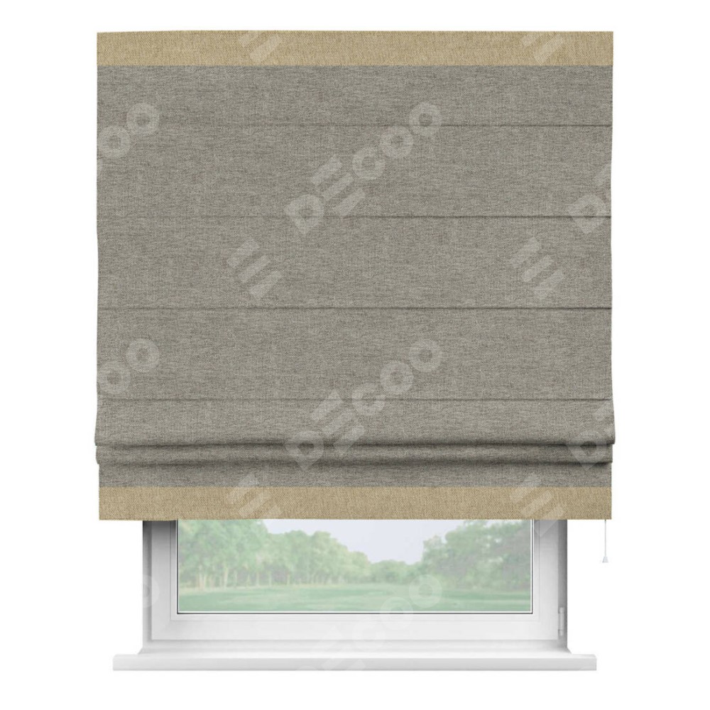 Римская штора производителя «Cortin», используется для проёма, пошита из ткани стиф димаут серо-коричневый, артикул 44028. Отделка шторы кантом «Горизонт», ткань для канта используется из стифа разной расцветки на выбор. Имеет универсальный механизм и подходит для монтажа: на потолок, на стену и в нишу.