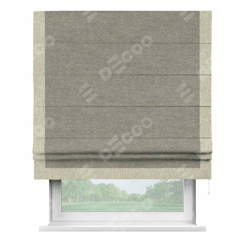 Римская штора производителя «Cortin», используется для проёма, пошита из ткани стиф димаут серо-коричневый, артикул 44028. Отделка шторы кантом «Виктория», ткань для канта используется из стифа разной расцветки на выбор. Имеет универсальный механизм и подходит для монтажа: на потолок, на стену и в нишу.