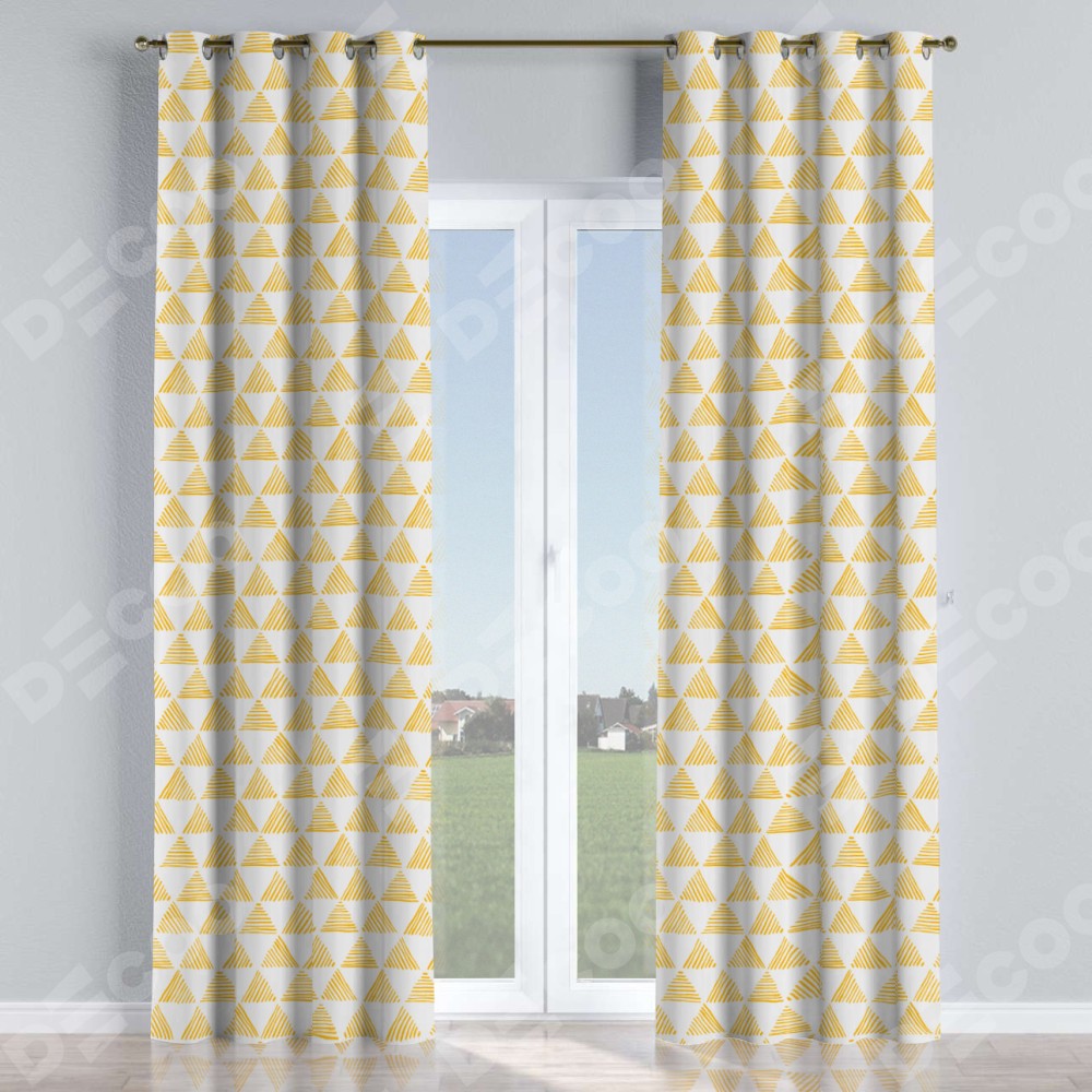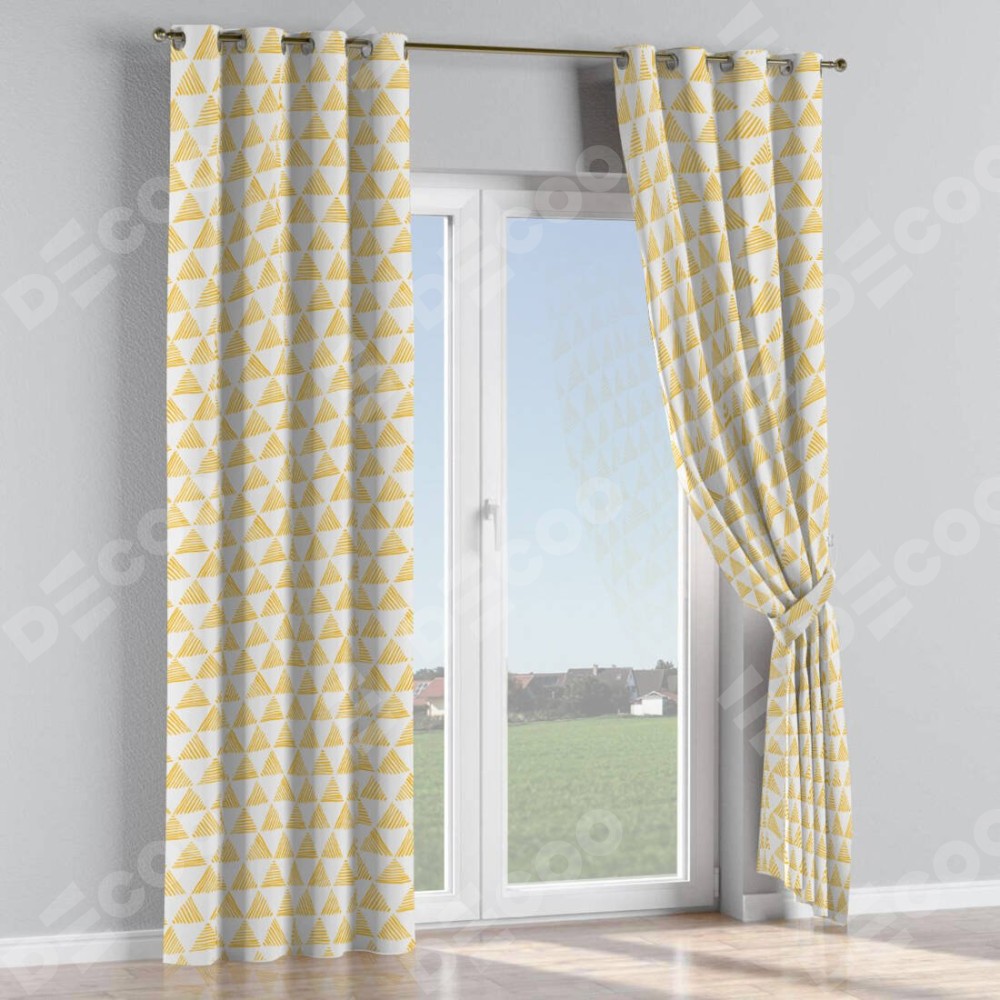 Комплект прямых штор, от производителя «Cortin», пошиты из ткани блэкаут с нанесением сублимационной печати «Желтые треугольники». Данная модель пошита на люверсах, комплектуется на выбор круглым карнизом и подходит для монтажа на стену или потолок. Прямые шторы на люверсах шьются по стандарту с коэффициентом 1/2 (на 100 см. ширины проёма 200 см. ширины ткани), отличительным преимуществом данной модели является простой способ монтажа. Достаточно повесить ее на трубу и штора готова!