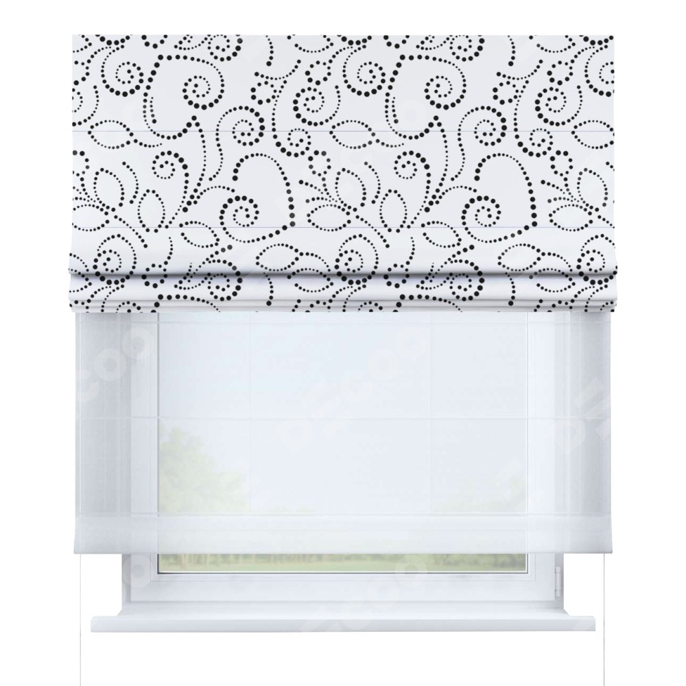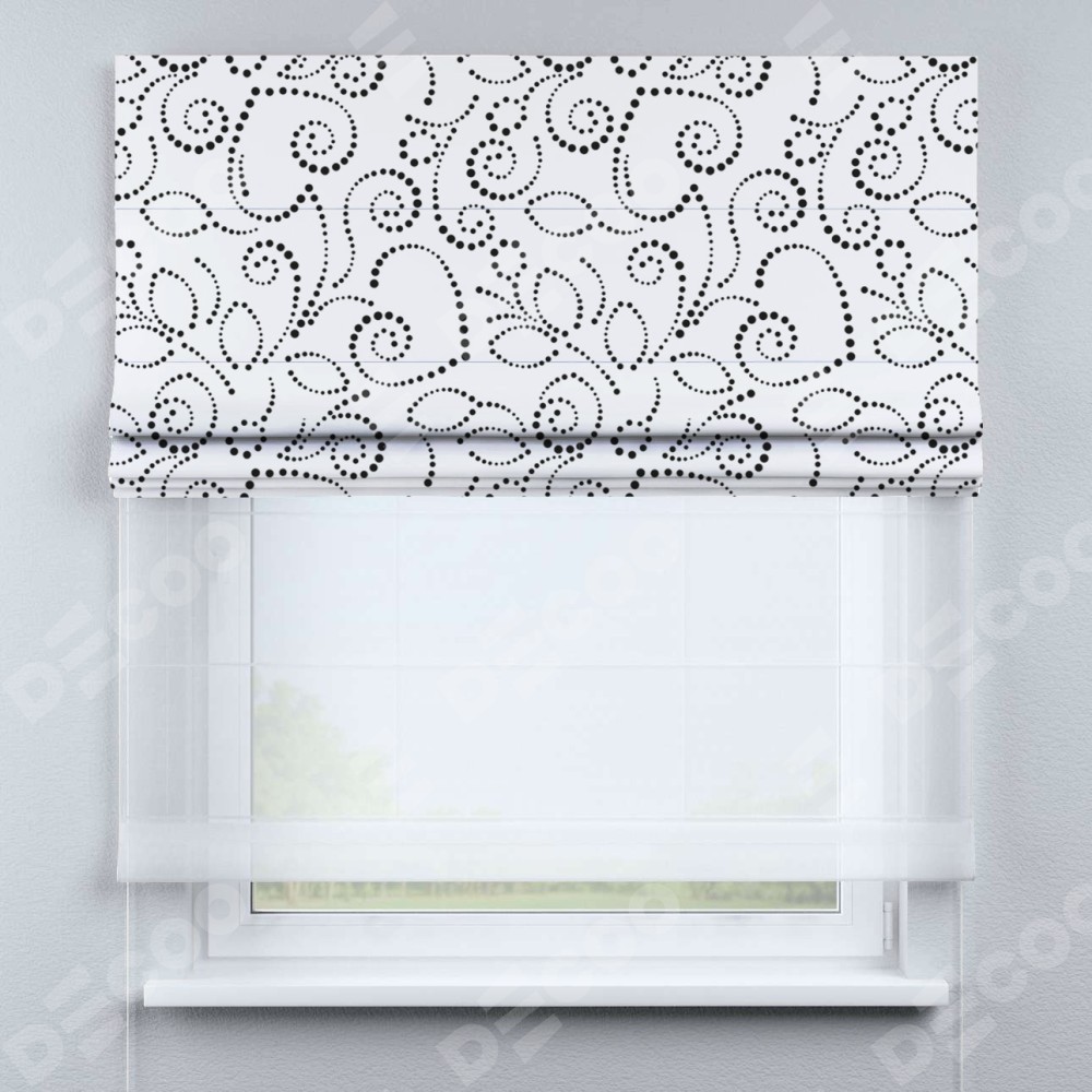 Римская штора день-ночь производителя «Cortin», используется для проёма, пошита из двух полотен, с лицевой блэкаут с нанесением сублимационной печати «Точечный узор», вторая ткань тюль (по стандарту комплектуется тюль белого цвета артикул V-01). Имеет универсальный механизм и подходит для монтажа: на потолок, на стену и в нишу.
