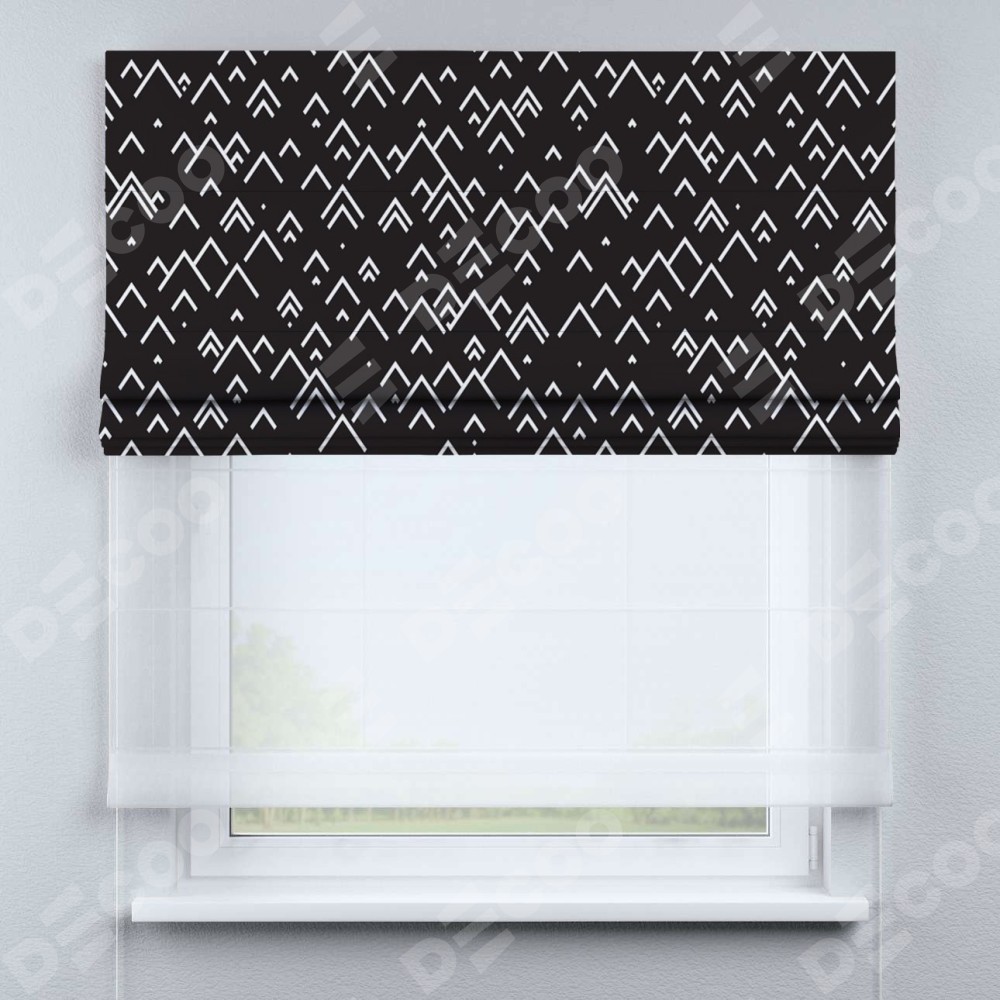Римская штора день-ночь производителя «Cortin», используется для проёма, пошита из двух полотен, с лицевой блэкаут с нанесением сублимационной печати «Черно-белый минимализм», вторая ткань тюль (по стандарту комплектуется тюль белого цвета артикул V-01). Имеет универсальный механизм и подходит для монтажа: на потолок, на стену и в нишу.