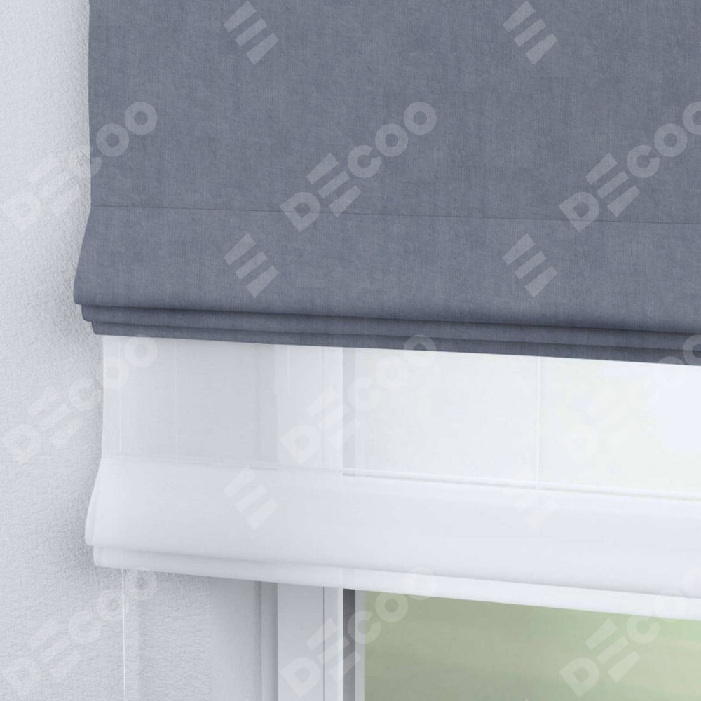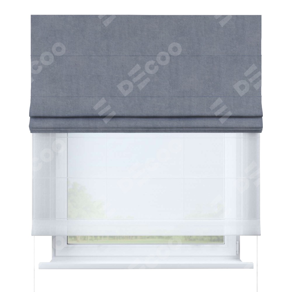Римская штора день-ночь производителя «Cortin», используется для проёма, пошита из двух полотен, с лицевой стороны канвас васильковый артикул v-203, вторая ткань тюль (по стандарту комплектуется тюль белого цвета артикул V-01). Имеет универсальный механизм и подходит для монтажа: на потолок, на стену и в нишу.