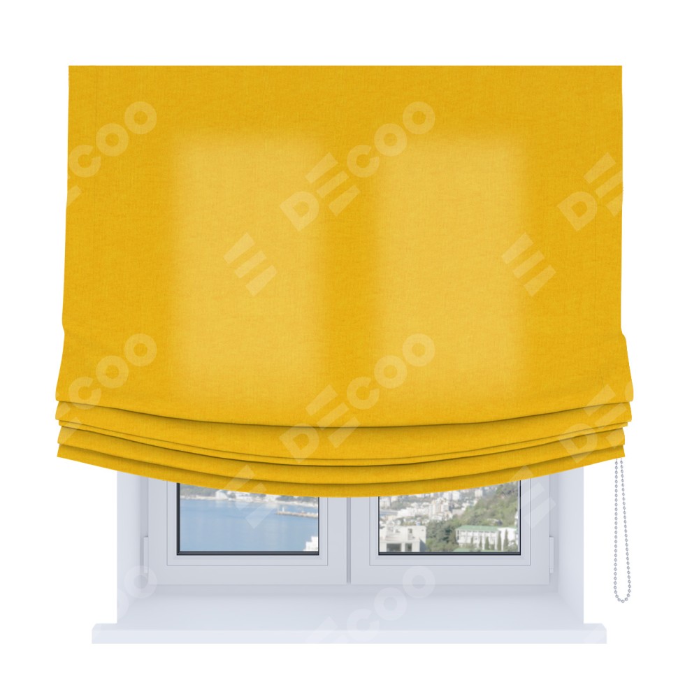 Римская штора Soft производителя «Cortin», используется для проёма, пошита из ткани канвас желтый, артикул ткани v-344. Имеет универсальный механизм и подходит для монтажа: на потолок, на стену и в нишу. В отличие от стандартных римских штор, римская штора Soft не имеет горизонтальных вставок и нижнего отвеса. Это позволяет ткани произвольно драпироваться в свободные мягкие складки.