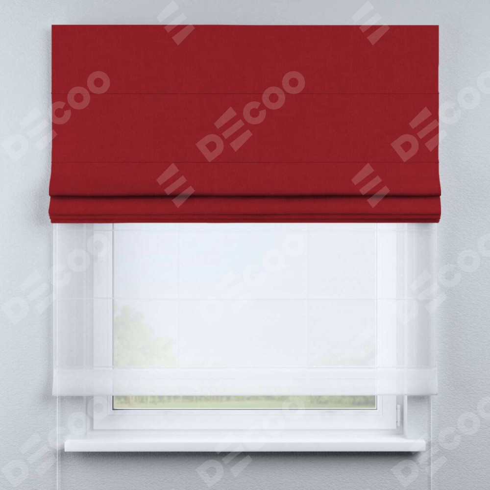 Римская штора день-ночь производителя «Cortin», используется для проёма, пошита из двух полотен, с лицевой стороны канвас красный артикул v-113, вторая ткань тюль (по стандарту комплектуется тюль белого цвета артикул V-01). Имеет универсальный механизм и подходит для монтажа: на потолок, на стену и в нишу.