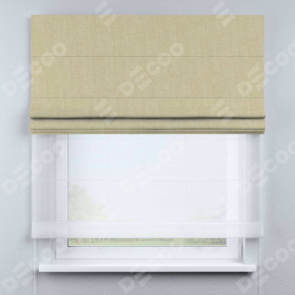 Римская штора день-ночь производителя «Cortin», используется для проёма, пошита из двух полотен, с лицевой стороны канвас тёмно-бежевый артикул v-196, вторая ткань тюль (по стандарту комплектуется тюль белого цвета артикул V-01). Имеет универсальный механизм и подходит для монтажа: на потолок, на стену и в нишу.