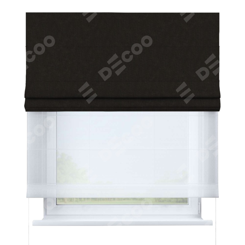 Римская штора день-ночь производителя «Cortin», используется для проёма, пошита из двух полотен, с лицевой стороны канвас тёмно-коричневый артикул v-13, вторая ткань тюль (по стандарту комплектуется тюль белого цвета артикул V-01). Имеет универсальный механизм и подходит для монтажа: на потолок, на стену и в нишу.