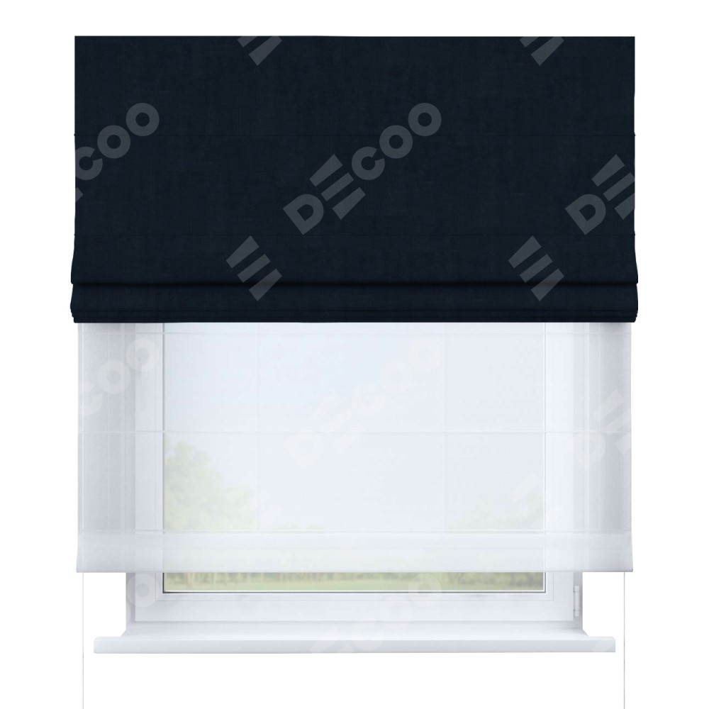 Римская штора день-ночь производителя «Cortin», используется для проёма, пошита из двух полотен, с лицевой стороны канвас тёмно-синий артикул v-206, вторая ткань тюль (по стандарту комплектуется тюль белого цвета артикул V-01). Имеет универсальный механизм и подходит для монтажа: на потолок, на стену и в нишу.