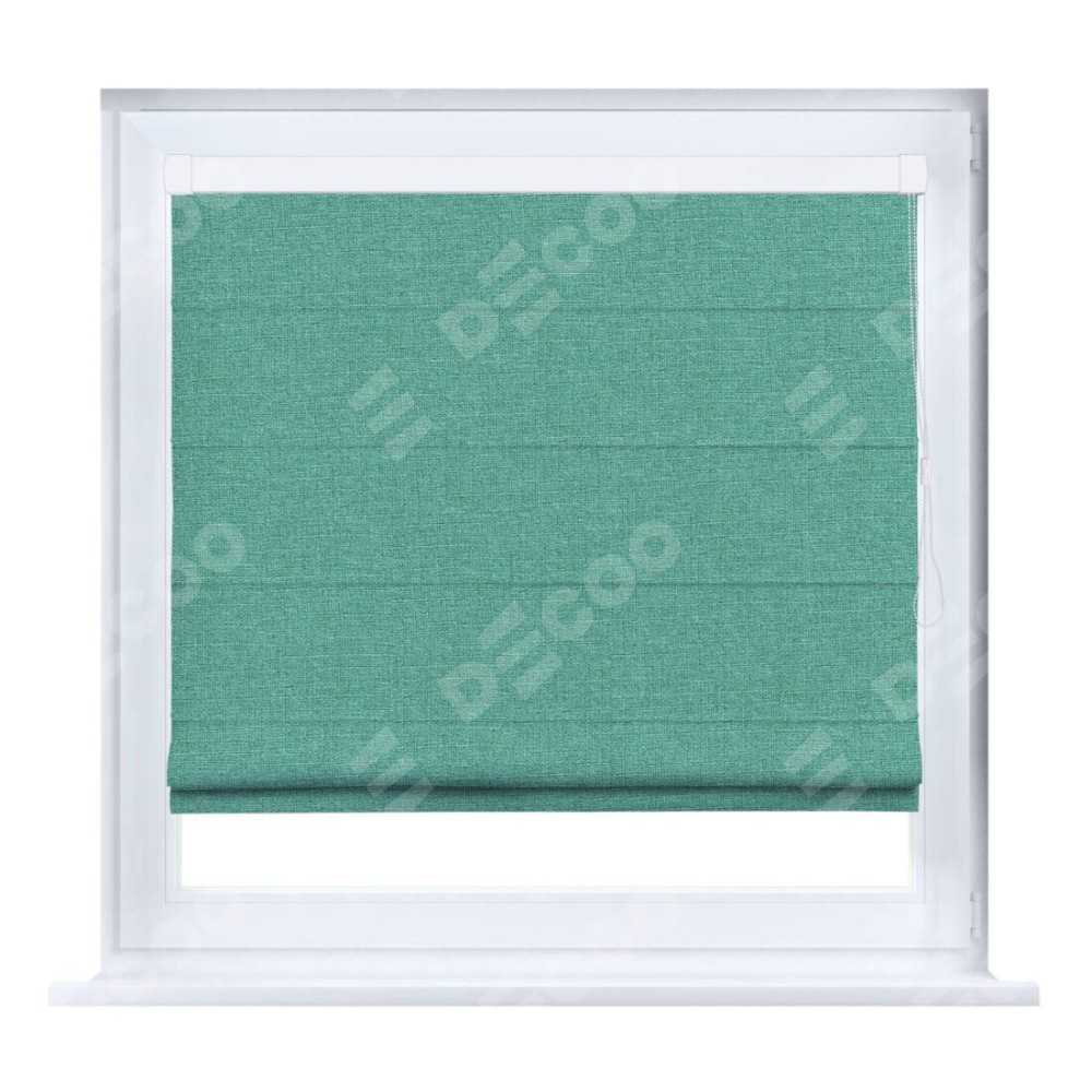 Римская штора производителя «Cortin», устанавливается на створку окна, пошита из ткани лён светло-бирюзовый, артикул 53435. Штора шьётся по индивидуальным размерам, для данного типа римской шторы возможная ширина от 35 до 150 см., высота до 250 см.