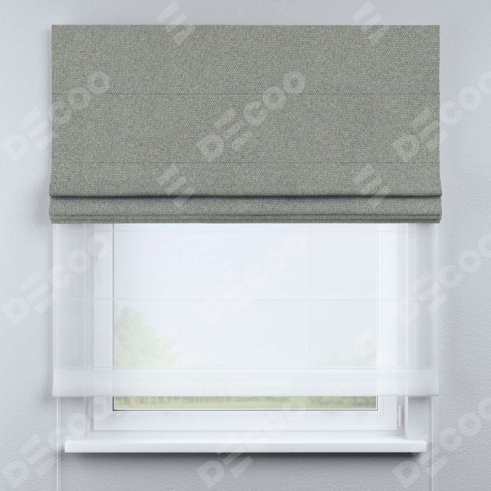 Римская штора день-ночь производителя «Cortin», используется для проёма, пошита из двух полотен, с лицевой стороны лён димаут серый артикул 91009, вторая ткань тюль (по стандарту комплектуется тюль белого цвета артикул V-01). Имеет универсальный механизм и подходит для монтажа: на потолок, на стену и в нишу.