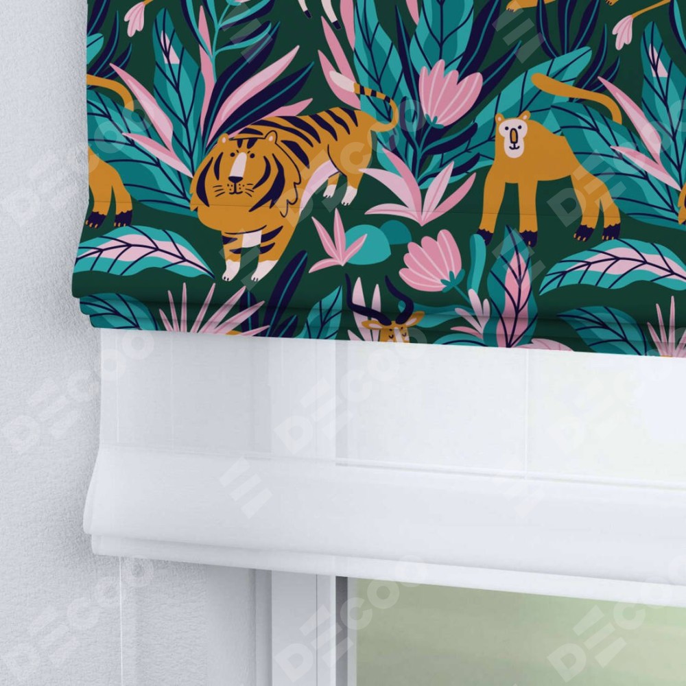 Римская штора день-ночь производителя «Cortin», используется для проёма, пошита из двух полотен, с лицевой блэкаут с нанесением сублимационной печати «Дикие животные», вторая ткань тюль (по стандарту комплектуется тюль белого цвета артикул V-01). Имеет универсальный механизм и подходит для монтажа: на потолок, на стену и в нишу.