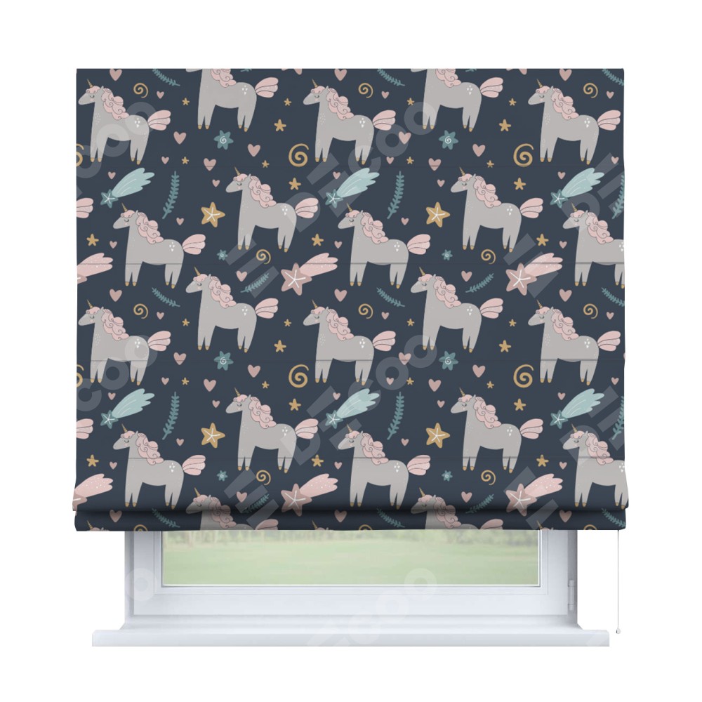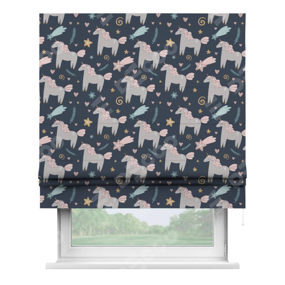 Римская штора производителя «Cortin», используется для проёма, пошита из ткани блэкаут с нанесением сублимационной печати «Милые единороги». Имеет универсальный механизм и подходит для монтажа: на потолок, на стену и в нишу.