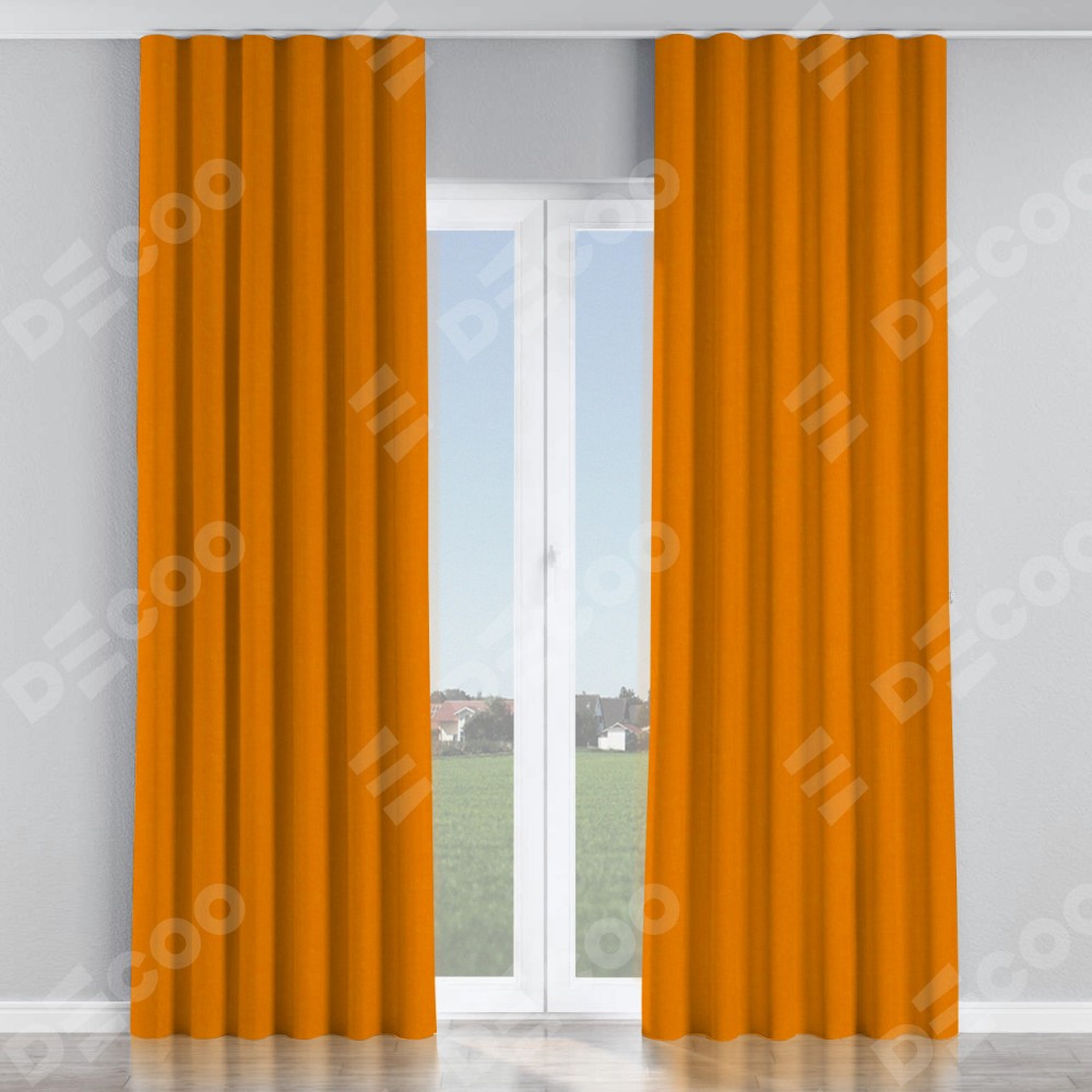 Комплект прямых штор, от производителя «Cortin», пошиты из ткани канвас оранжевый, артикул ткани v-106. С изнаночной стороны в верхней части штор пристрачивается шторная лента с декоративными складками «Волна». Для создания элегантных складок прямые шторы шьются по стандарту с коэффициентом 1:2 (на 100 см. ширины проёма 200 см. ширины ткани).
