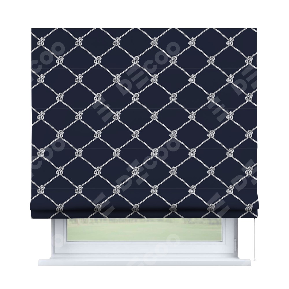 Римская штора производителя «Cortin», используется для проёма, пошита из ткани блэкаут с нанесением сублимационной печати «Морские веревки». Имеет универсальный механизм и подходит для монтажа: на потолок, на стену и в нишу.