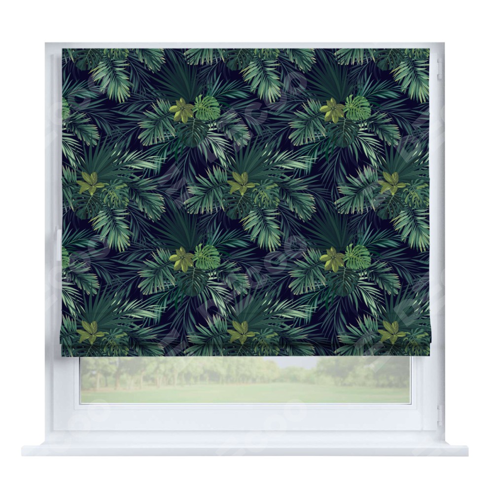 Римская штора производителя «Cortin», устанавливается на створку окна, пошита из ткани блэкаут с нанесением сублимационной печати «Пальмовые листья». Штора шьётся по индивидуальным размерам, для данного типа римской шторы возможная ширина от 35 до 150 см., высота до 250 см.