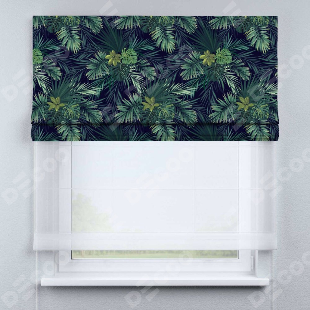 Римская штора день-ночь производителя «Cortin», используется для проёма, пошита из двух полотен, с лицевой блэкаут с нанесением сублимационной печати «Пальмовые листья», вторая ткань тюль (по стандарту комплектуется тюль белого цвета артикул V-01). Имеет универсальный механизм и подходит для монтажа: на потолок, на стену и в нишу.