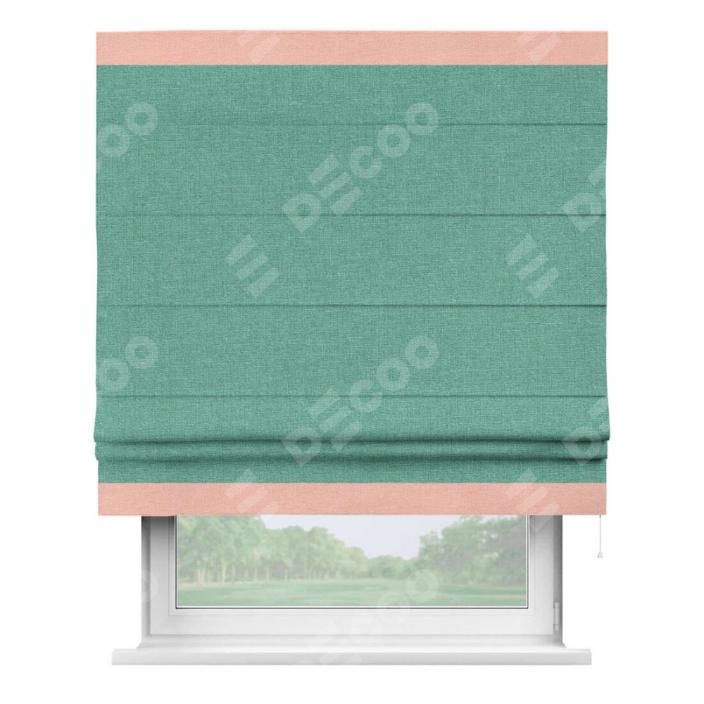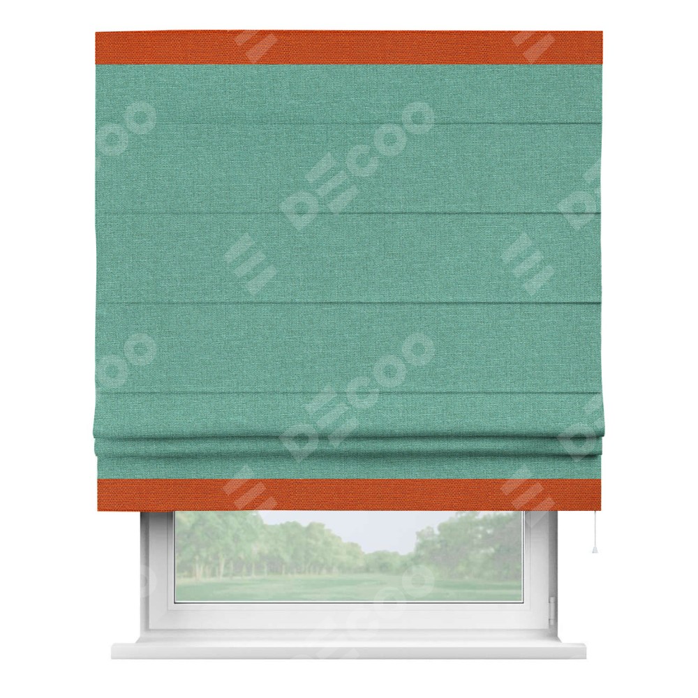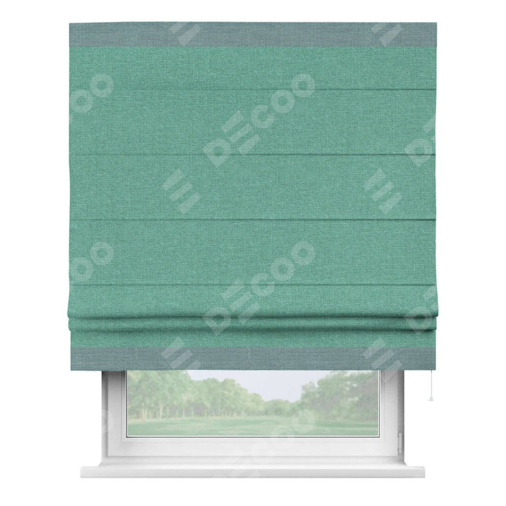 Римская штора производителя «Cortin», используется для проёма, пошита из ткани лён светло-бирюзовый, артикул 53435. Отделка шторы кантом «Горизонт», ткань для канта используется из льна разной расцветки на выбор. Имеет универсальный механизм и подходит для монтажа: на потолок, на стену и в нишу.