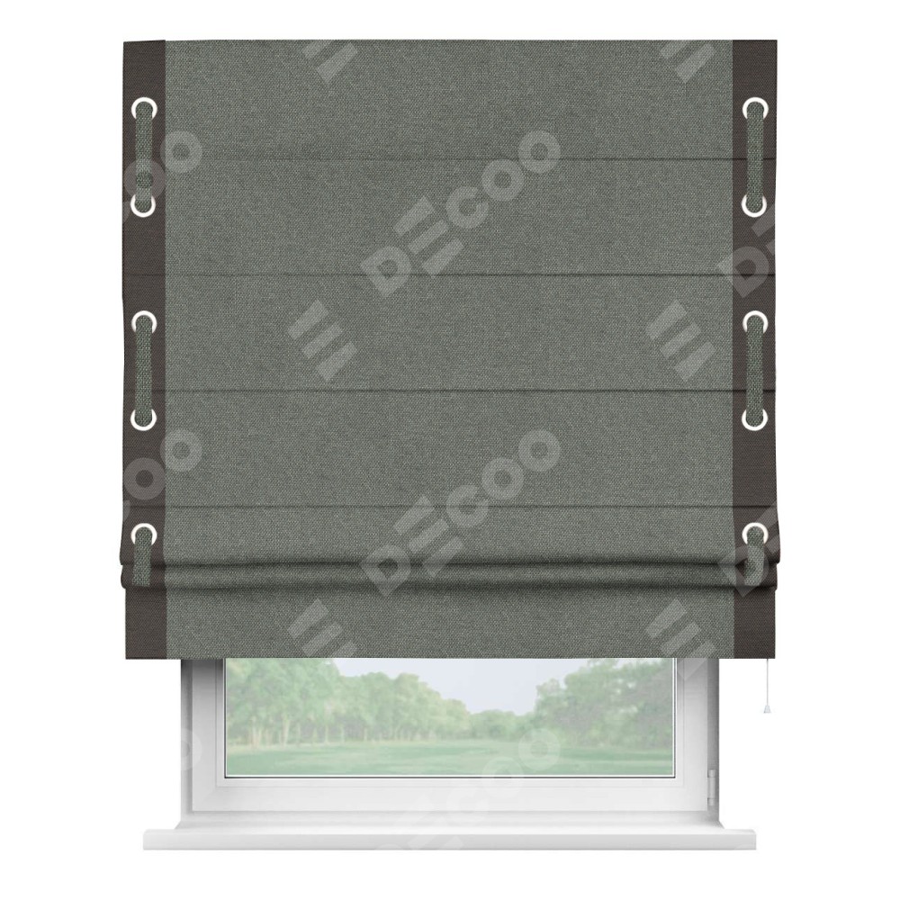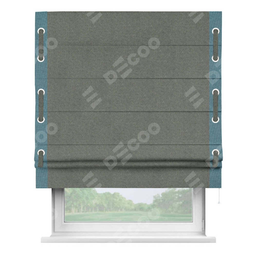 Римская штора производителя «Cortin», используется для проёма, пошита из ткани лён димаут тёмно-серый, артикул 91011. Отделка шторы кантом «Стрим Дуо» на кантах расположены люверсы с пояском, ткань для канта используется лён димаут разной расцветки на выбор. Ткань для пояска обычно используется из основной ткани шторы, а так же можно сделать из любой расцветки по желанию. Имеет универсальный механизм и подходит для монтажа: на потолок, на стену и в нишу.