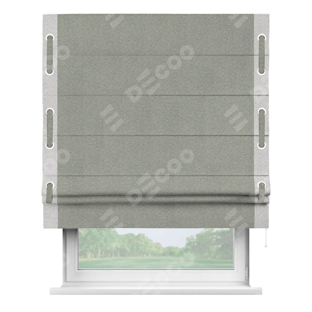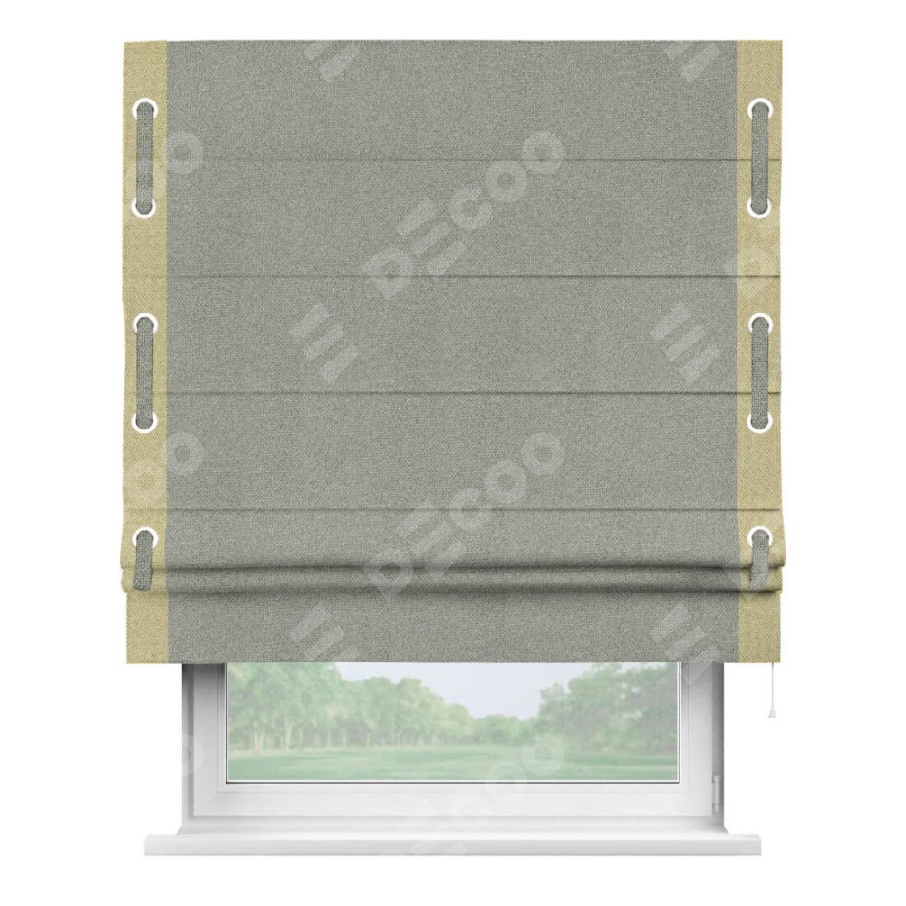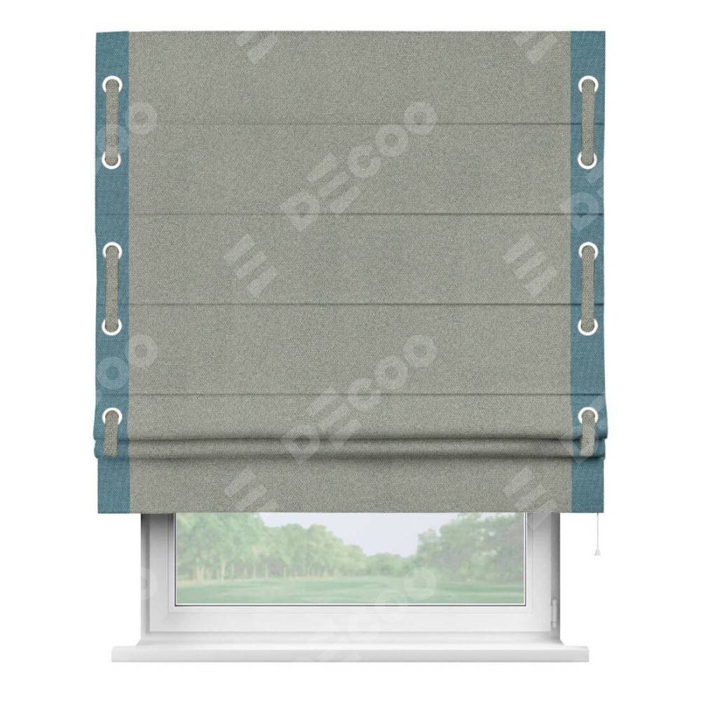 Римская штора производителя «Cortin», используется для проёма, пошита из ткани лён димаут серый, артикул 91009. Отделка шторы кантом «Стрим Дуо» на кантах расположены люверсы с пояском, ткань для канта используется лён димаут разной расцветки на выбор. Ткань для пояска обычно используется из основной ткани шторы, а так же можно сделать из любой расцветки по желанию. Имеет универсальный механизм и подходит для монтажа: на потолок, на стену и в нишу.