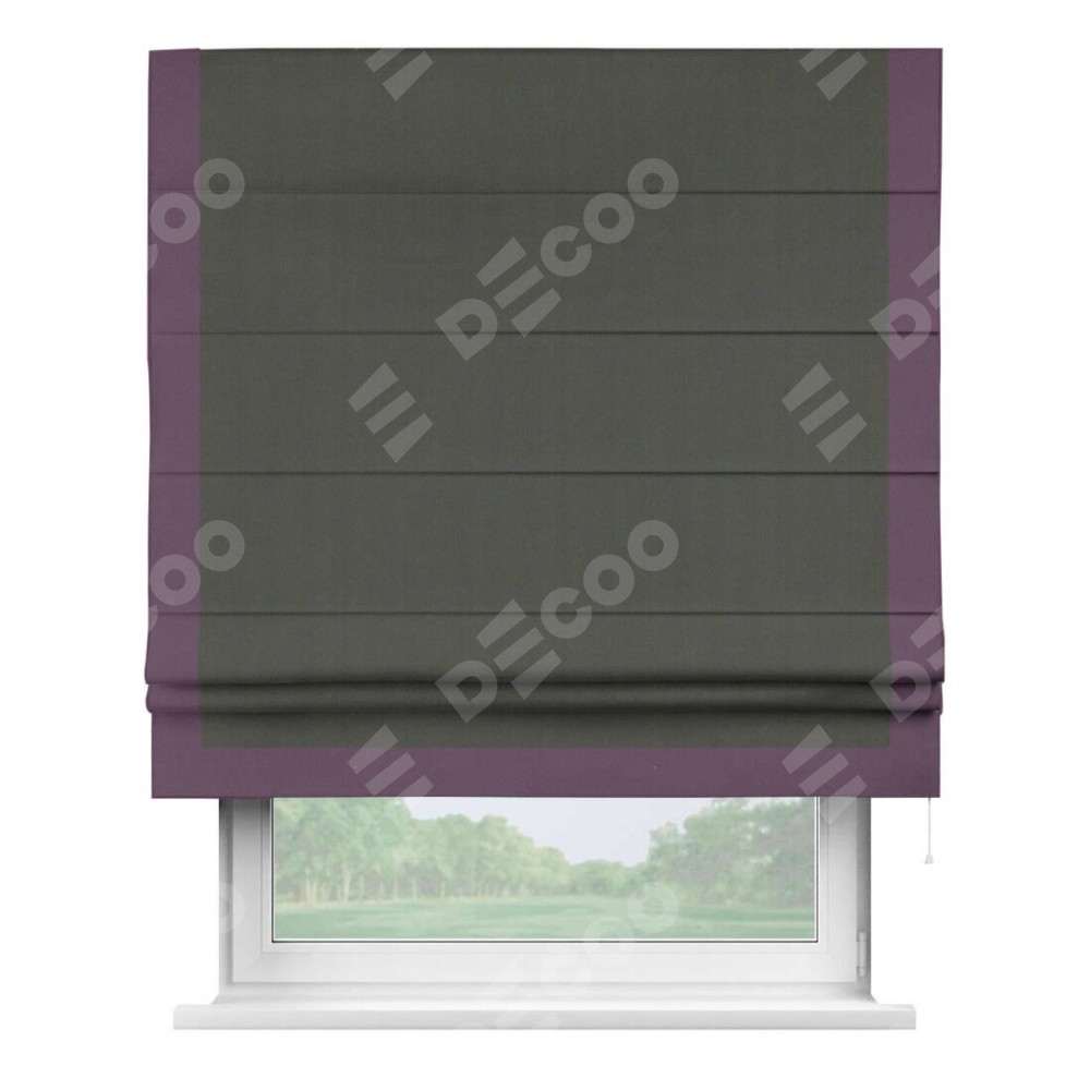 Римская штора производителя «Cortin», используется для проёма, пошита из ткани блэкаут однотонный дымчато-серый, артикул ткани 91571−1. Отделка шторы кантом «Виктория», ткань для канта используется из блэкаута однотонного разной расцветки на выбор. Имеет универсальный механизм и подходит для монтажа: на потолок, на стену и в нишу.