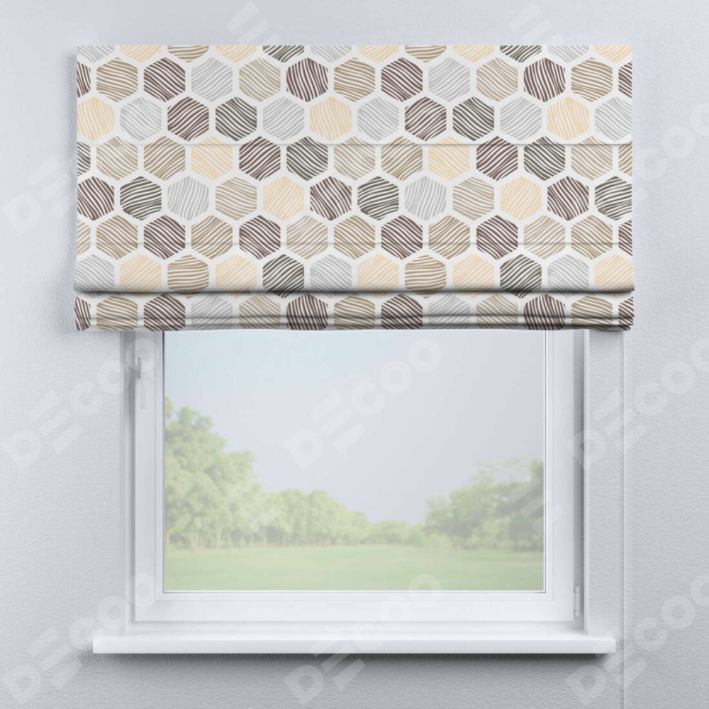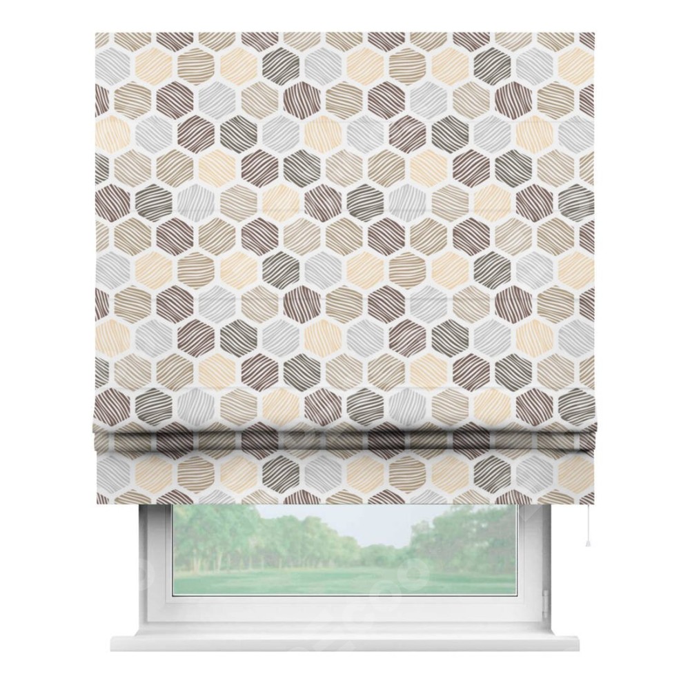 Классическая римская штора производителя «Cortin», пошита из ткани блэкаут с нанесением сублимационной печати «Мозаика соты». Имеет универсальный механизм и подходит для монтажа: на потолок, на стену и в нишу.