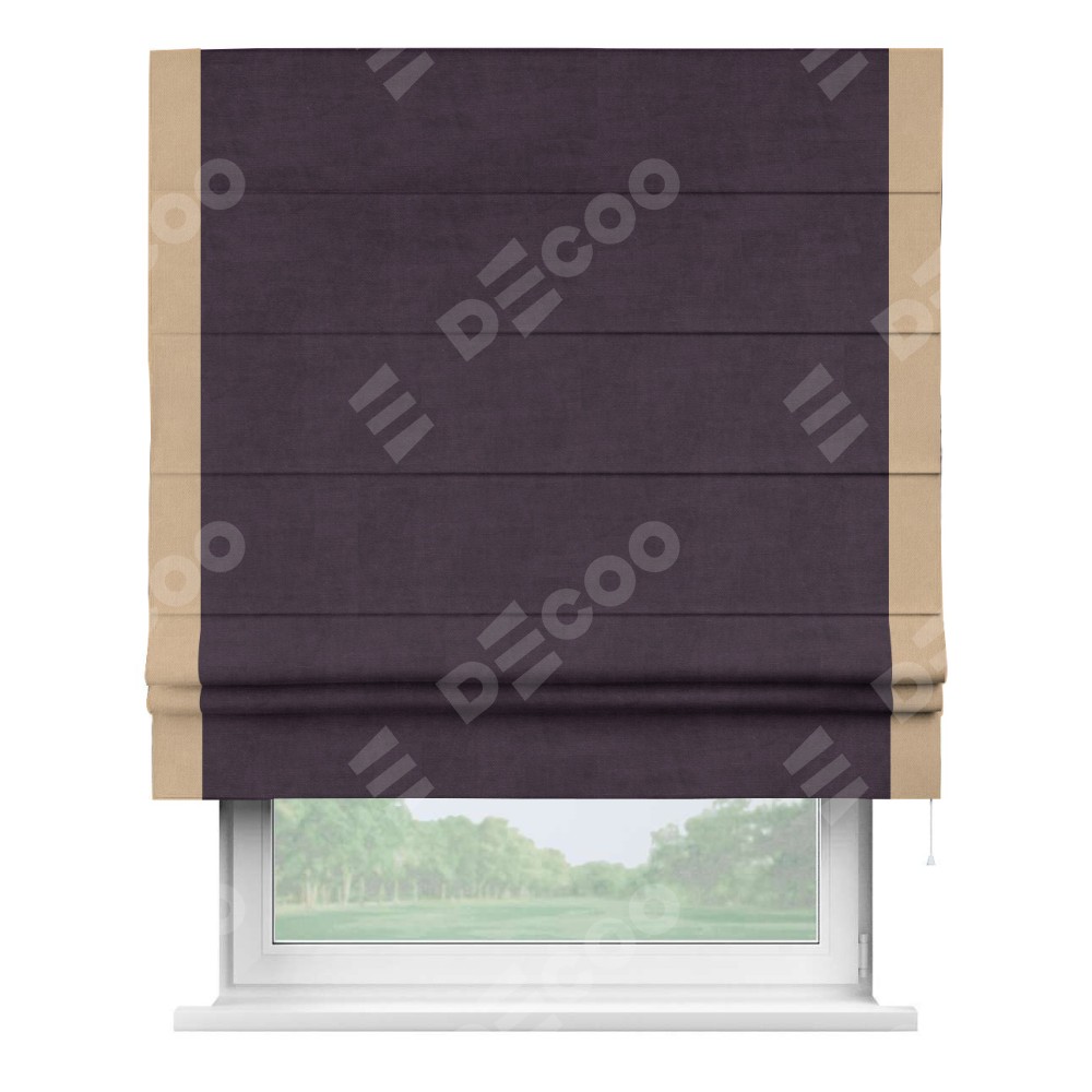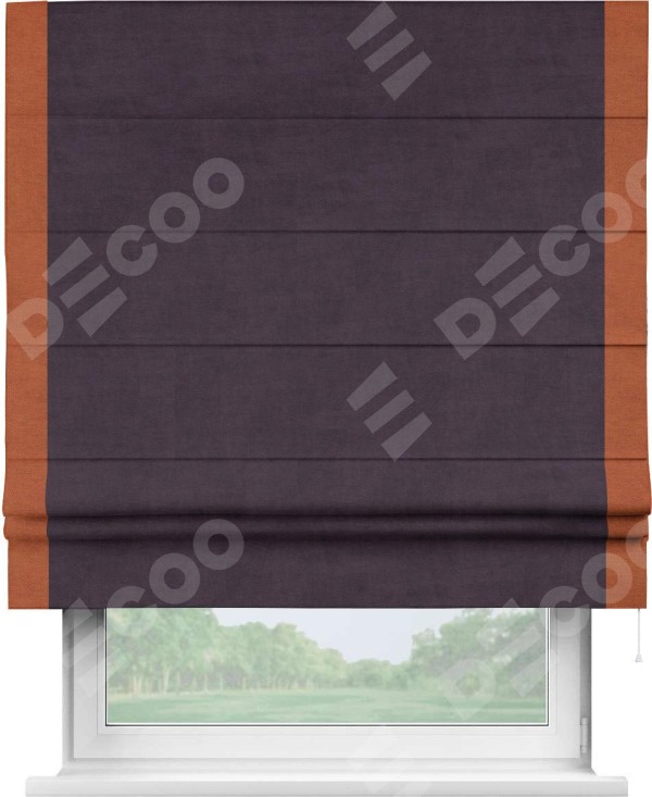 Римская штора производителя «Cortin», используется для проёма, пошита из ткани вельвет тёмно-фиолетовый, артикул ткани 72403. Отделка шторы кантом «Стрим Дуо», ткань для канта используется из вельвета разной расцветки на выбор. Имеет универсальный механизм и подходит для монтажа: на потолок, на стену и в нишу.
