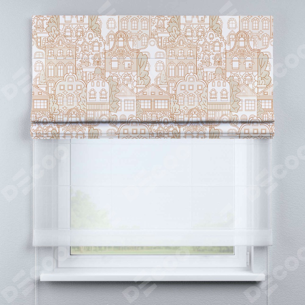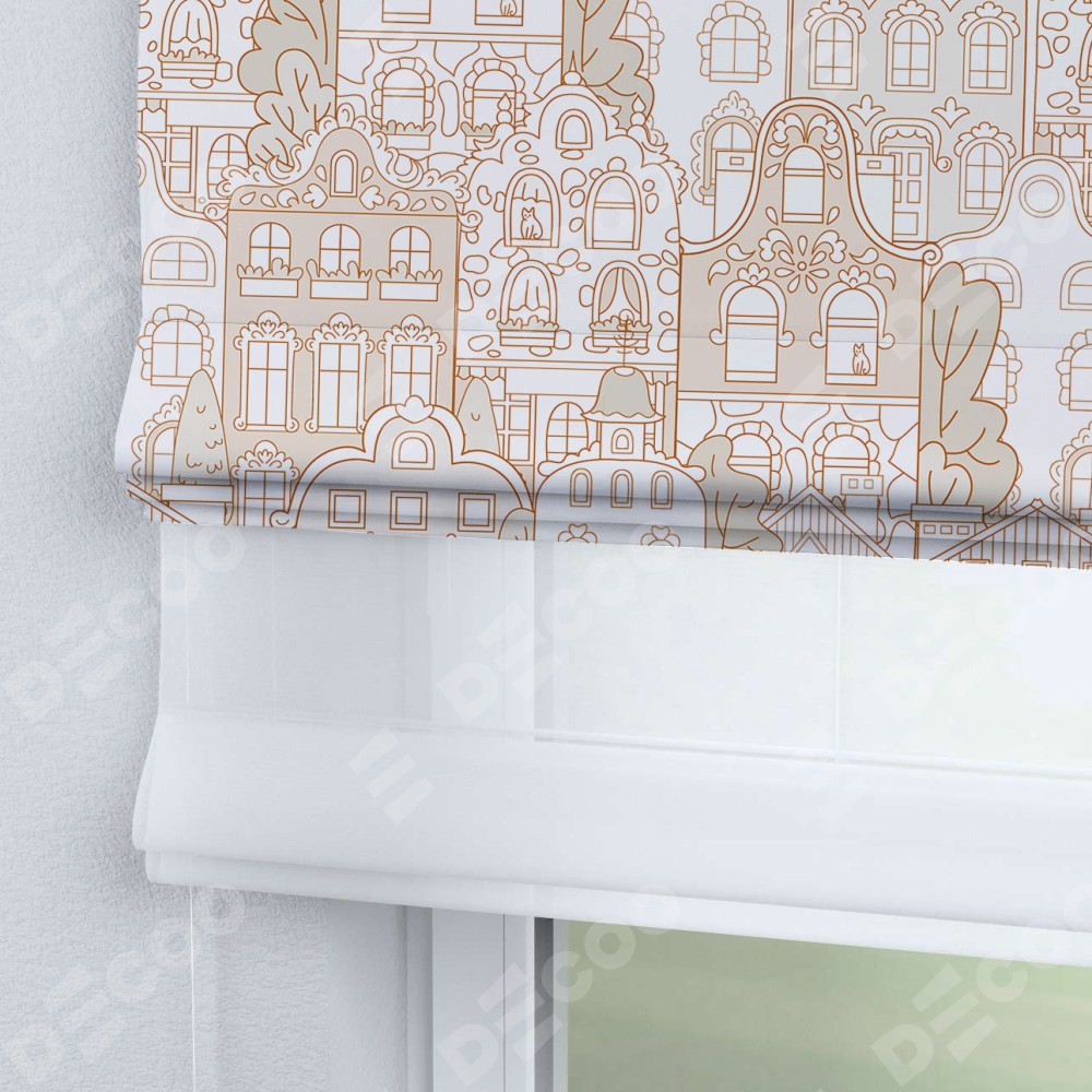 Двойная римская штора «День-ночь» от производителя Cortin предназначена для использования в проёмах. Эта штора уникальна тем, что состоит из двух полотен. На лицевой стороне находится блэкаут с нанесением сублимационной печати «Милый городок», обеспечивающий эффективное затемнение. В комплект также входит вторая ткань — легкий белый тюль (артикул: V-01), который добавляет изящества и легкости оформлению окна. Кроме того, доступны и другие разновидности ткани тюль, выбор которых доступен по ссылке .