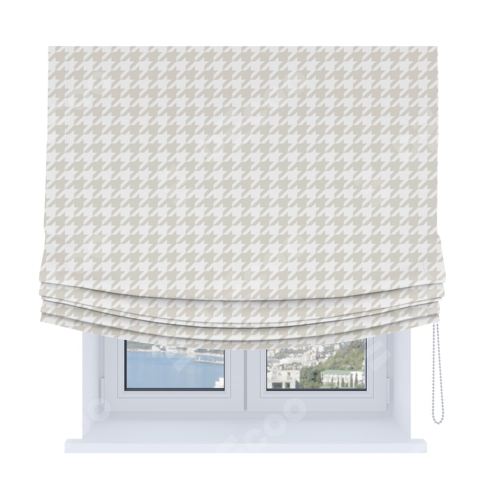 Римская штора Soft производителя «Cortin», используется для проёма, пошита из ткани блэкаут с нанесением сублимационной печати «Гусиные лапки» молочный». Имеет универсальный механизм и подходит для монтажа: на потолок, на стену и в нишу. В отличие от стандартных римских штор, римская штора Soft не имеет горизонтальных вставок и нижнего отвеса. Это позволяет ткани произвольно драпироваться в свободные мягкие складки.