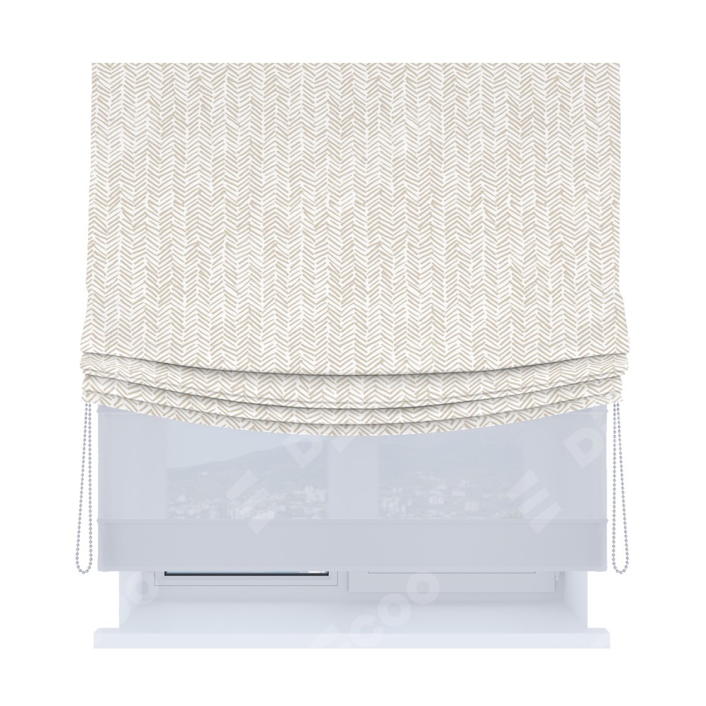 Римская штора день-ночь производителя «Cortin», используется для проёма, пошита из двух полотен, с лицевой блэкаут с нанесением сублимационной печати «Узор „Ёлочка“ бежевый», вторая ткань тюль (по стандарту комплектуется тюль белого цвета артикул V-01). Имеет универсальный механизм и подходит для монтажа: на потолок, на стену и в нишу. Удобное управление каждой шторой отдельно.