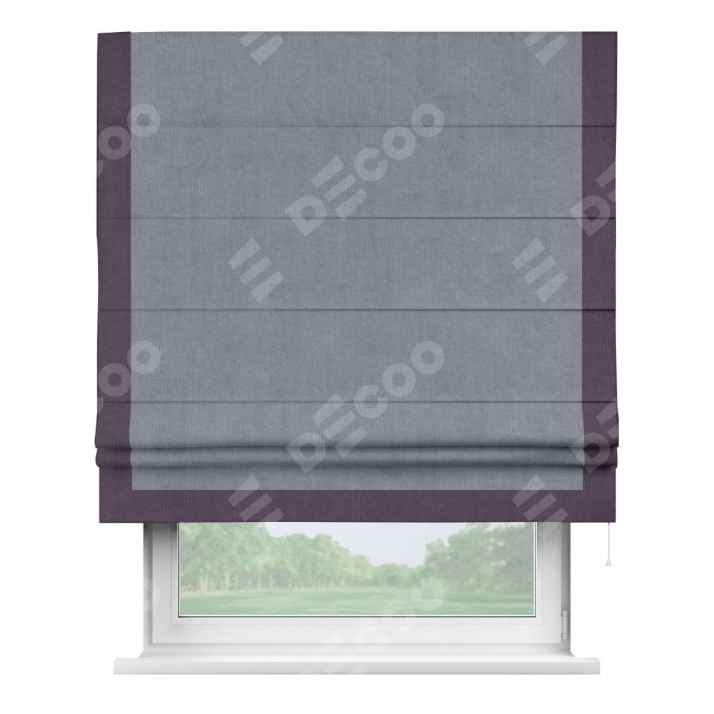 Римская штора производителя «Cortin», используется для проёма, пошита из ткани канвас васильковый, артикул ткани v-203. Отделка шторы кантом «Виктория» (баклажановый v-111), ткань для канта используется из канваса разной расцветки на выбор. Имеет универсальный механизм и подходит для монтажа: на потолок, на стену и в нишу.
