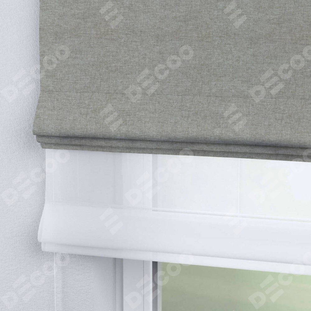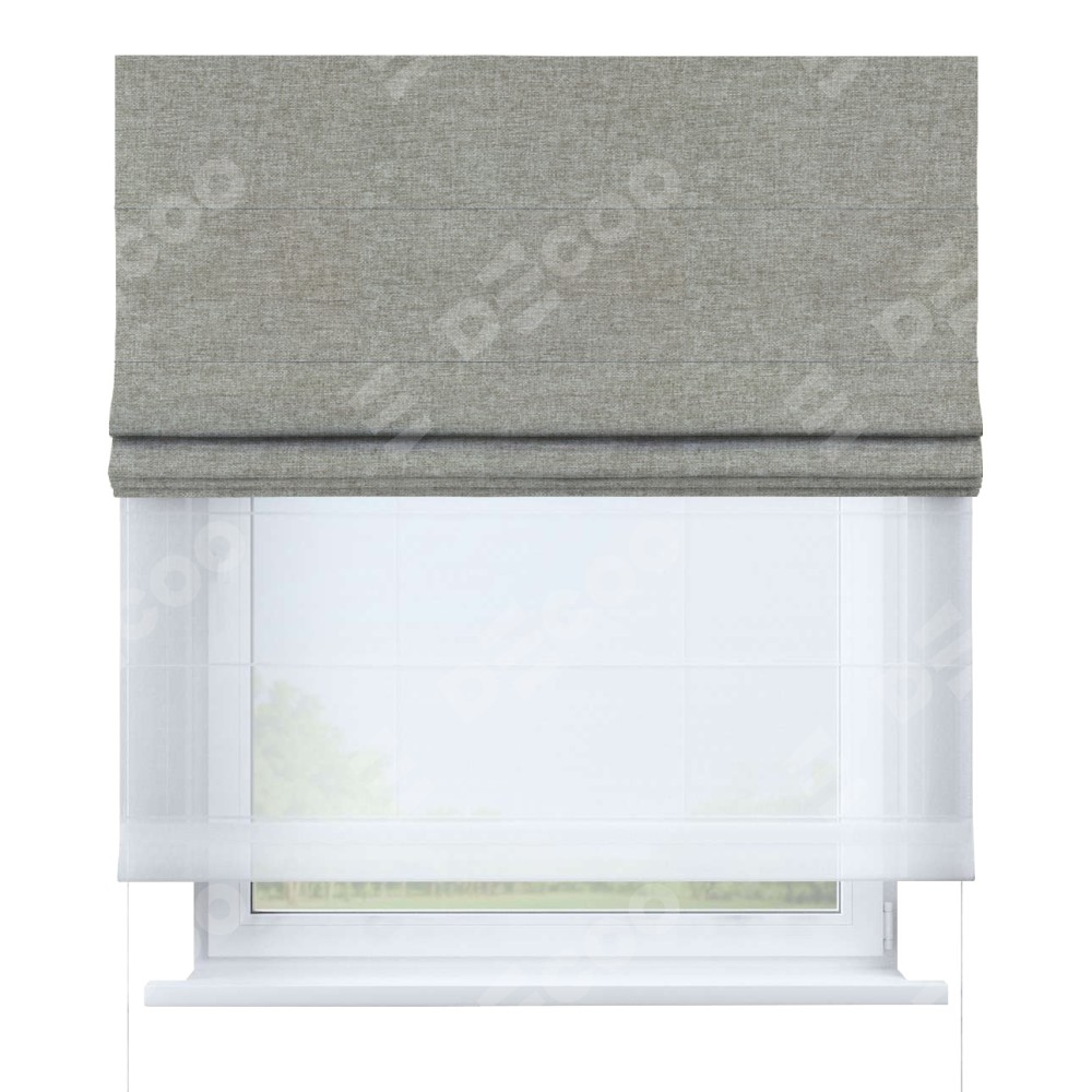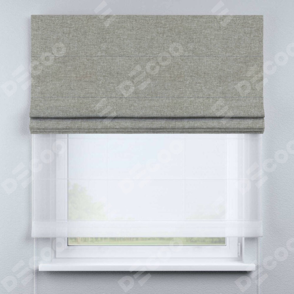 Римская штора день-ночь производителя «Cortin», используется для проёма, пошита из двух полотен, с лицевой стороны лён кашемир серый артикул 17208, вторая ткань тюль (по стандарту комплектуется тюль белого цвета артикул V-01). Имеет универсальный механизм и подходит для монтажа: на потолок, на стену и в нишу.