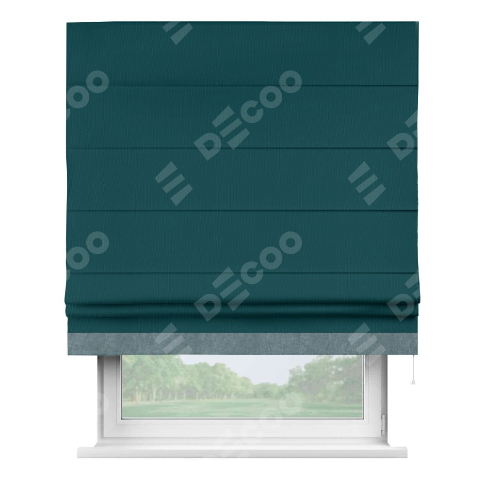 Римская штора производителя «Cortin», используется для проёма, пошита из ткани канвас изумрудный, артикул ткани v-12487. Отделка шторы кантом «Джестер» (серо-голубой v-330), ткань для канта используется из канваса разной расцветки на выбор. Имеет универсальный механизм и подходит для монтажа: на потолок, на стену и в нишу.