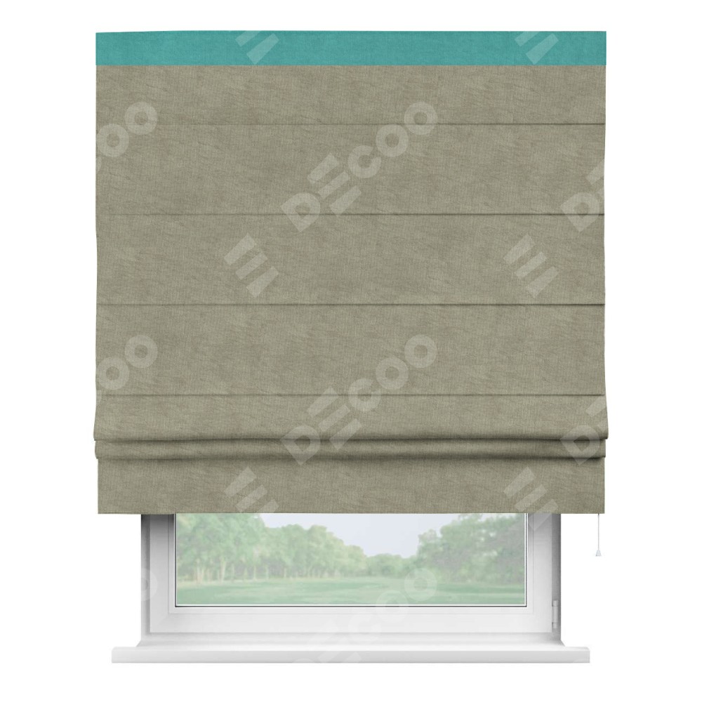 Римская штора производителя «Cortin», используется для проёма, пошита из ткани канвас капучино, артикул ткани v-211. Отделка шторы кантом «Кинг» (бирюзовый v-1048), ткань для канта используется из канваса разной расцветки на выбор. Имеет универсальный механизм и подходит для монтажа: на потолок, на стену и в нишу.