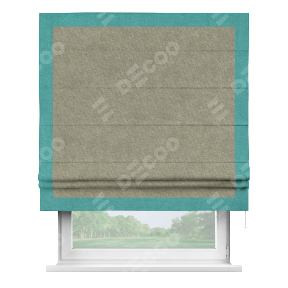 Римская штора производителя «Cortin», используется для проёма, пошита из ткани канвас капучино, артикул ткани v-211. Отделка шторы кантом «Чесс» (бирюзовый v-1048), ткань для канта используется из канваса разной расцветки на выбор. Имеет универсальный механизм и подходит для монтажа: на потолок, на стену и в нишу.