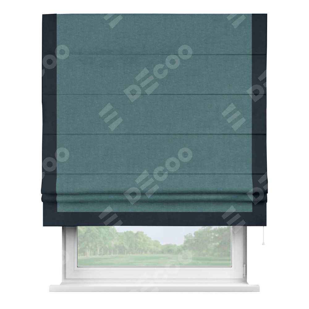 Римская штора производителя «Cortin», используется для проёма, пошита из ткани канвас ментоловый, артикул ткани v-114. Отделка шторы кантом «Виктория» (тёмно-синий v-206), ткань для канта используется из канваса разной расцветки на выбор. Имеет универсальный механизм и подходит для монтажа: на потолок, на стену и в нишу.