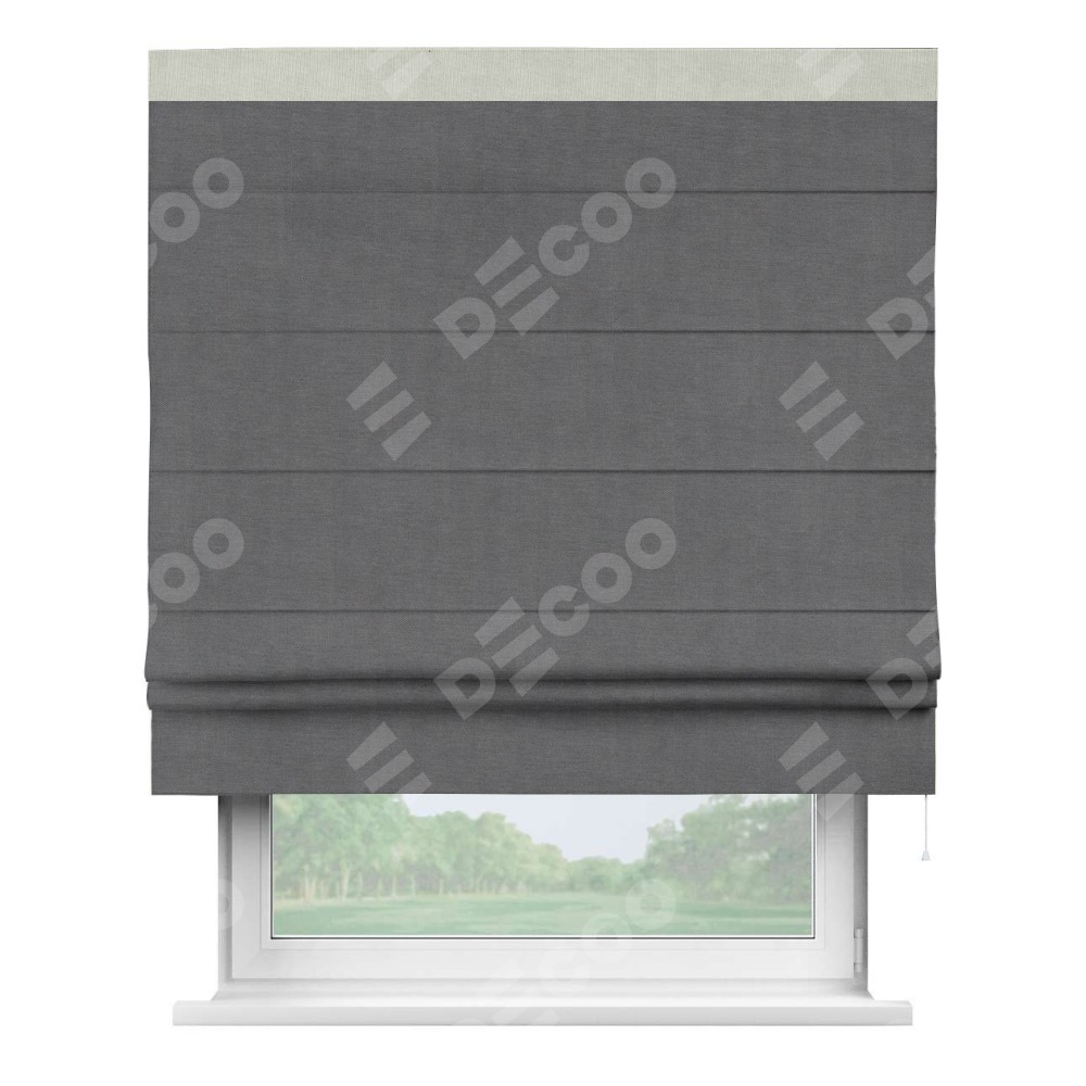 Римская штора производителя «Cortin», используется для проёма, пошита из ткани канвас мокрый асфальт, артикул ткани v-1083. Отделка шторы кантом «Кинг» (светло-серый v-371), ткань для канта используется из канваса разной расцветки на выбор. Имеет универсальный механизм и подходит для монтажа: на потолок, на стену и в нишу.