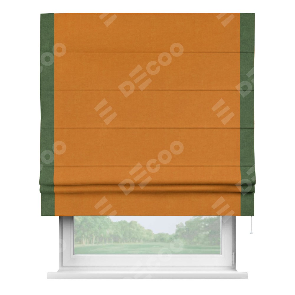 Римская штора производителя «Cortin», используется для проёма, пошита из ткани канвас оранжевый, артикул ткани v-106. Отделка шторы кантом «Стрим Дуо» (зелёный v-16), ткань для канта используется из канваса разной расцветки на выбор. Имеет универсальный механизм и подходит для монтажа: на потолок, на стену и в нишу.