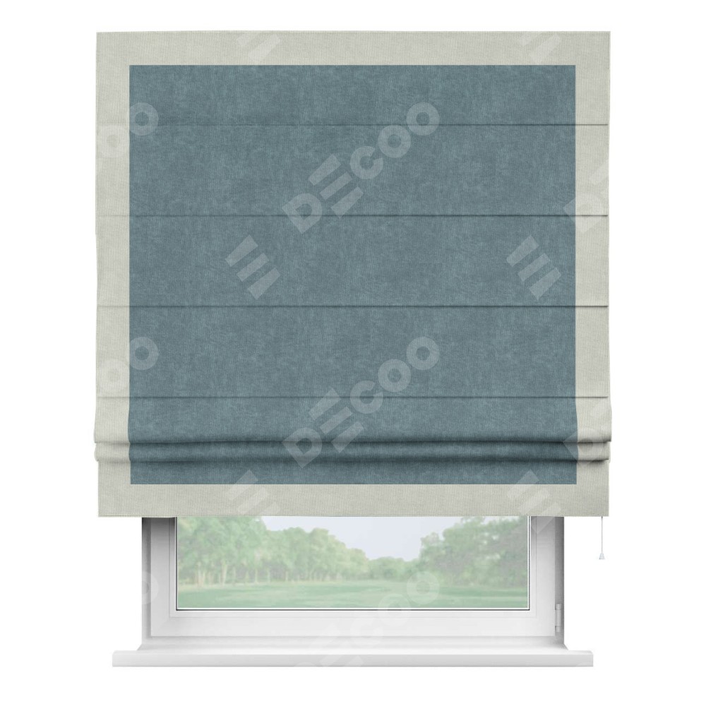 Римская штора производителя «Cortin», используется для проёма, пошита из ткани канвас серо-голубой, артикул ткани v-330. Отделка шторы кантом «Чесс» (светло-серый v-371), ткань для канта используется из канваса разной расцветки на выбор. Имеет универсальный механизм и подходит для монтажа: на потолок, на стену и в нишу.