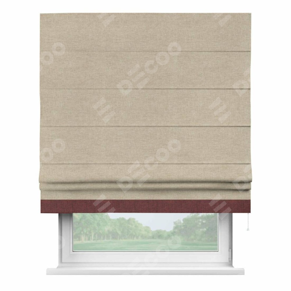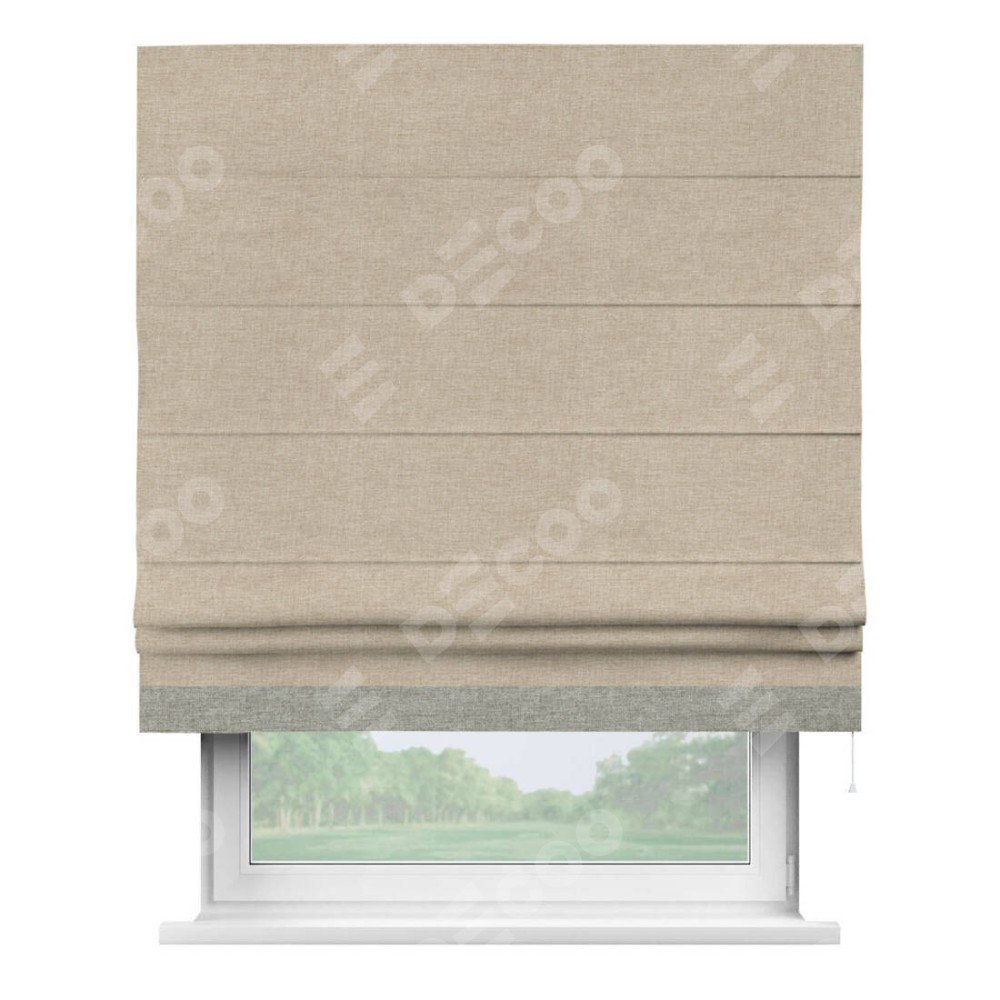 Римская штора производителя «Cortin», используется для проёма, пошита из ткани лён кашемир бежевый, артикул 17206. Отделка шторы кантом «Джестер», ткань для канта используется из льна разной расцветки на выбор. Имеет универсальный механизм и подходит для монтажа: на потолок, на стену и в нишу.
